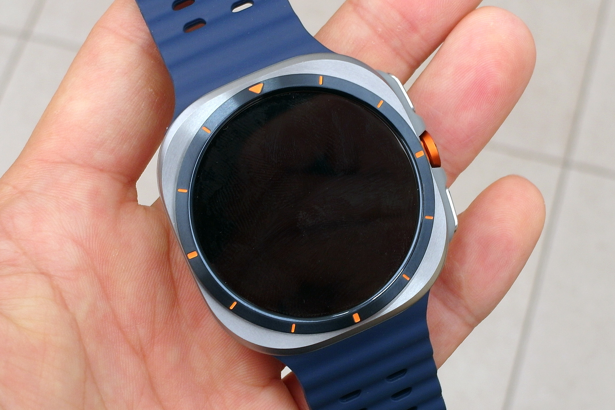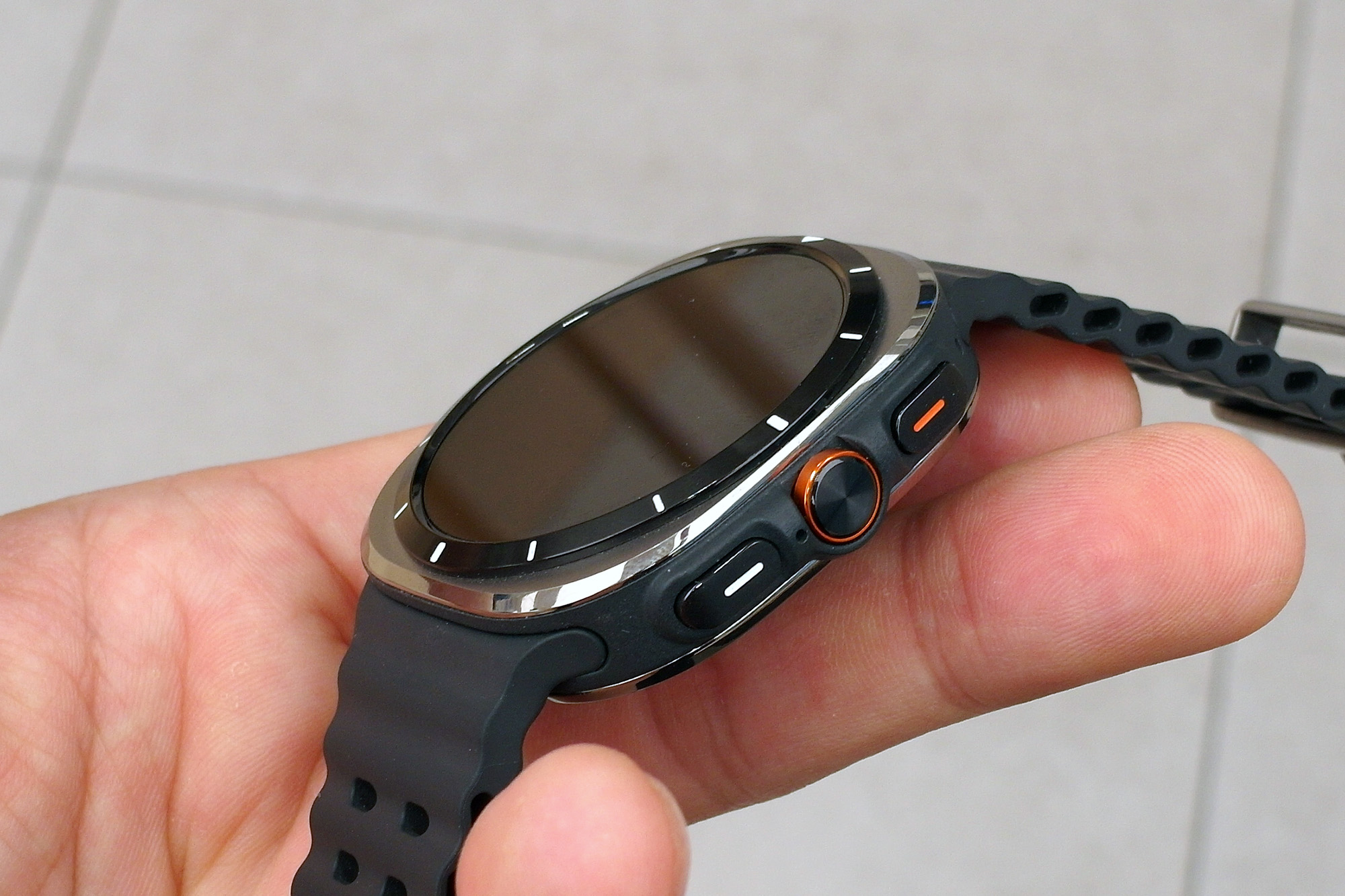 제가 가장 마음에 들었던 컬러는 삼성 갤럭시 워치 울트라 티타늄 그레이입니다. 모서리 엣지 부분을 제외하고는 어두운 느낌의 무광으로 마무리되었는데요. 오렌지 컬러의 스트랩과 매칭이 좋은 편이라고 생각되었습니다. 그런데 오렌지 밴드 때문에 애플워치 울트라와 유사하다는 의견이 있었습니다.
