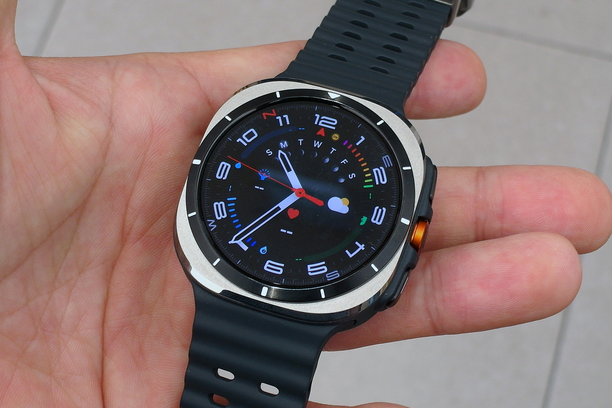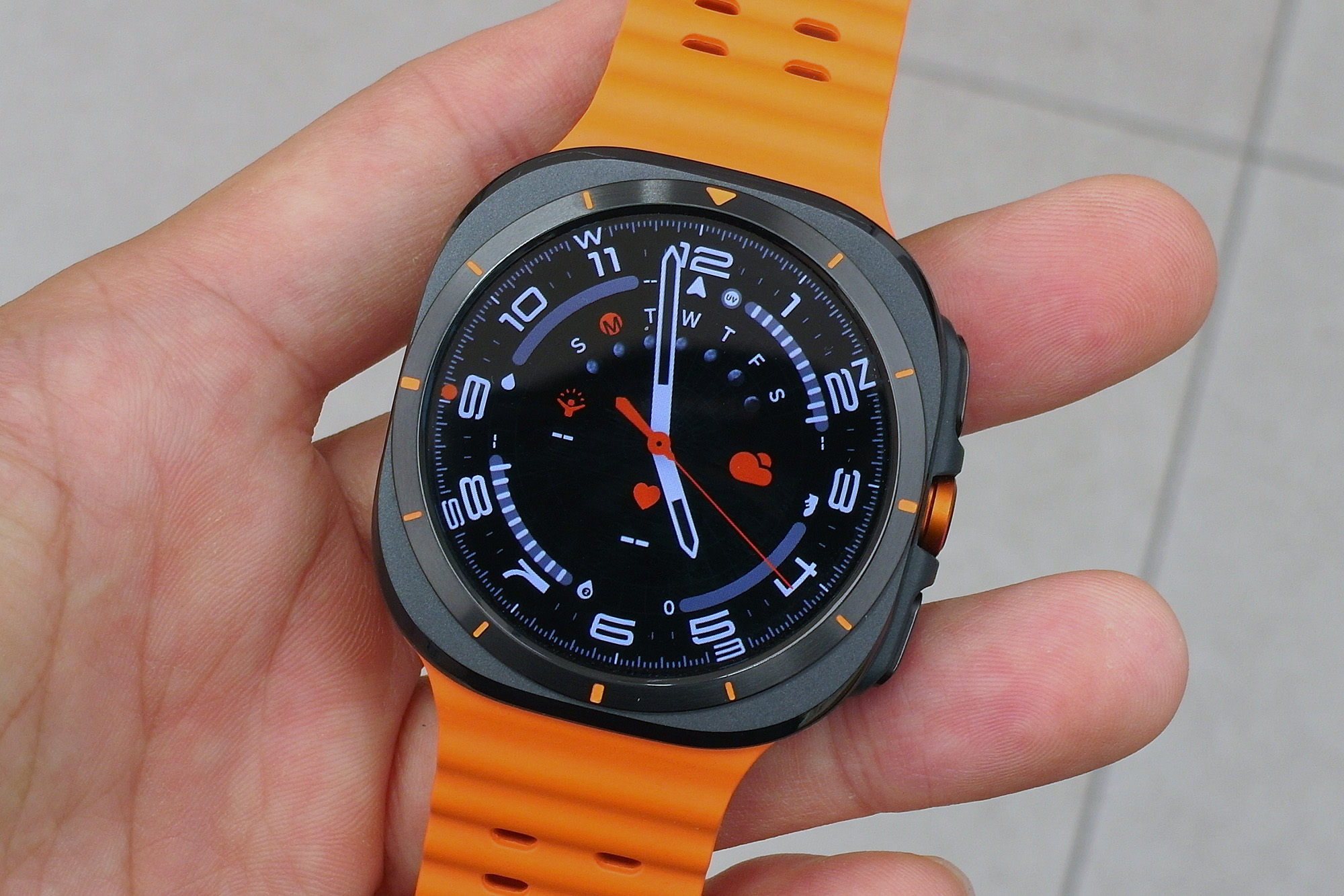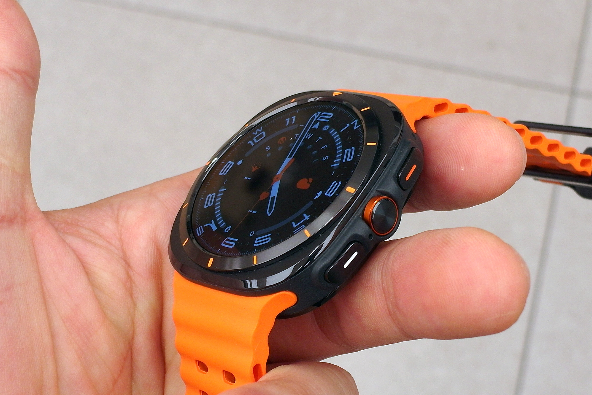 제가 가장 마음에 들었던 컬러는 삼성 갤럭시 워치 울트라 티타늄 그레이입니다. 모서리 엣지 부분을 제외하고는 어두운 느낌의 무광으로 마무리되었는데요. 오렌지 컬러의 스트랩과 매칭이 좋은 편이라고 생각되었습니다. 그런데 오렌지 밴드 때문에 애플워치 울트라와 유사하다는 의견이 있었습니다.