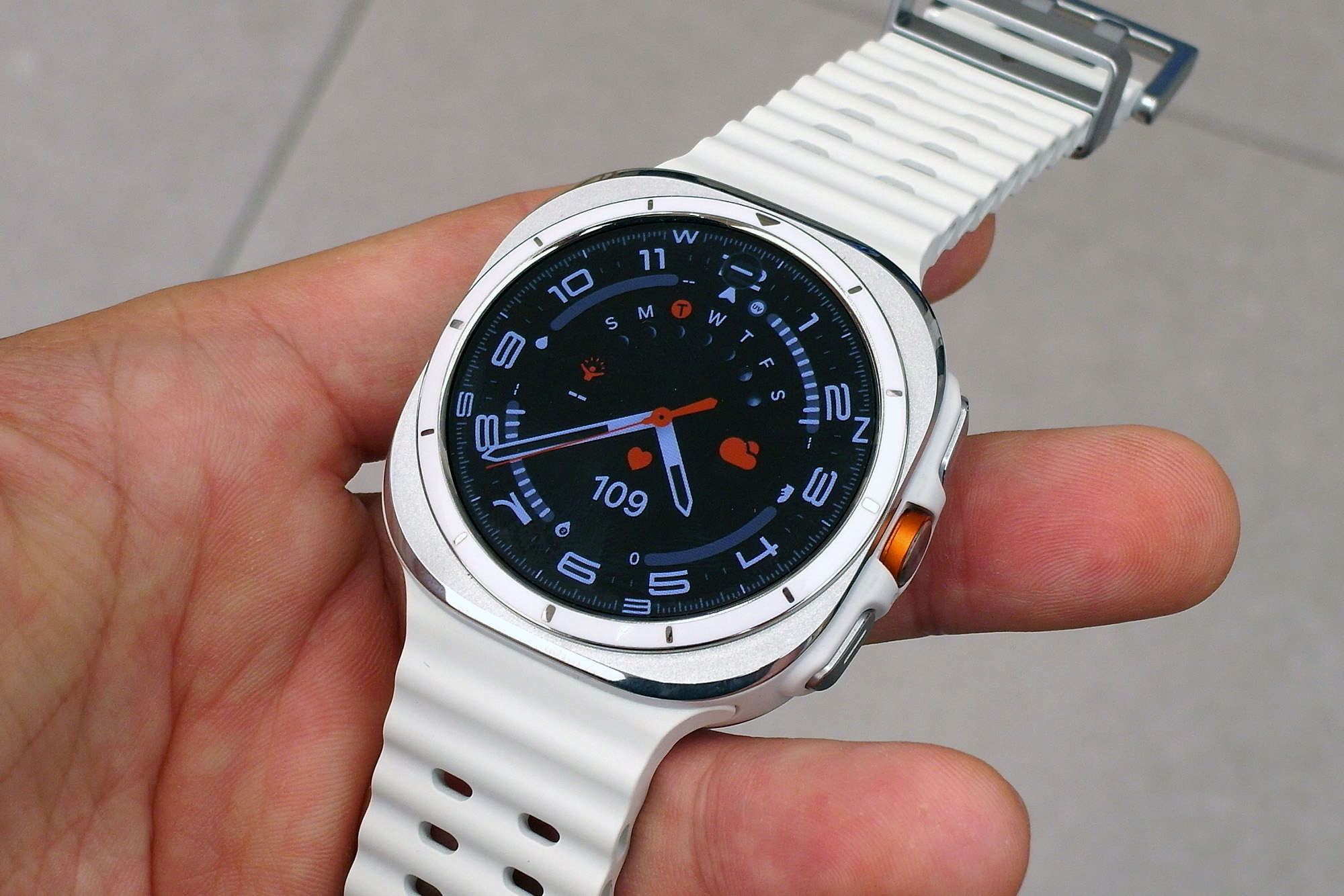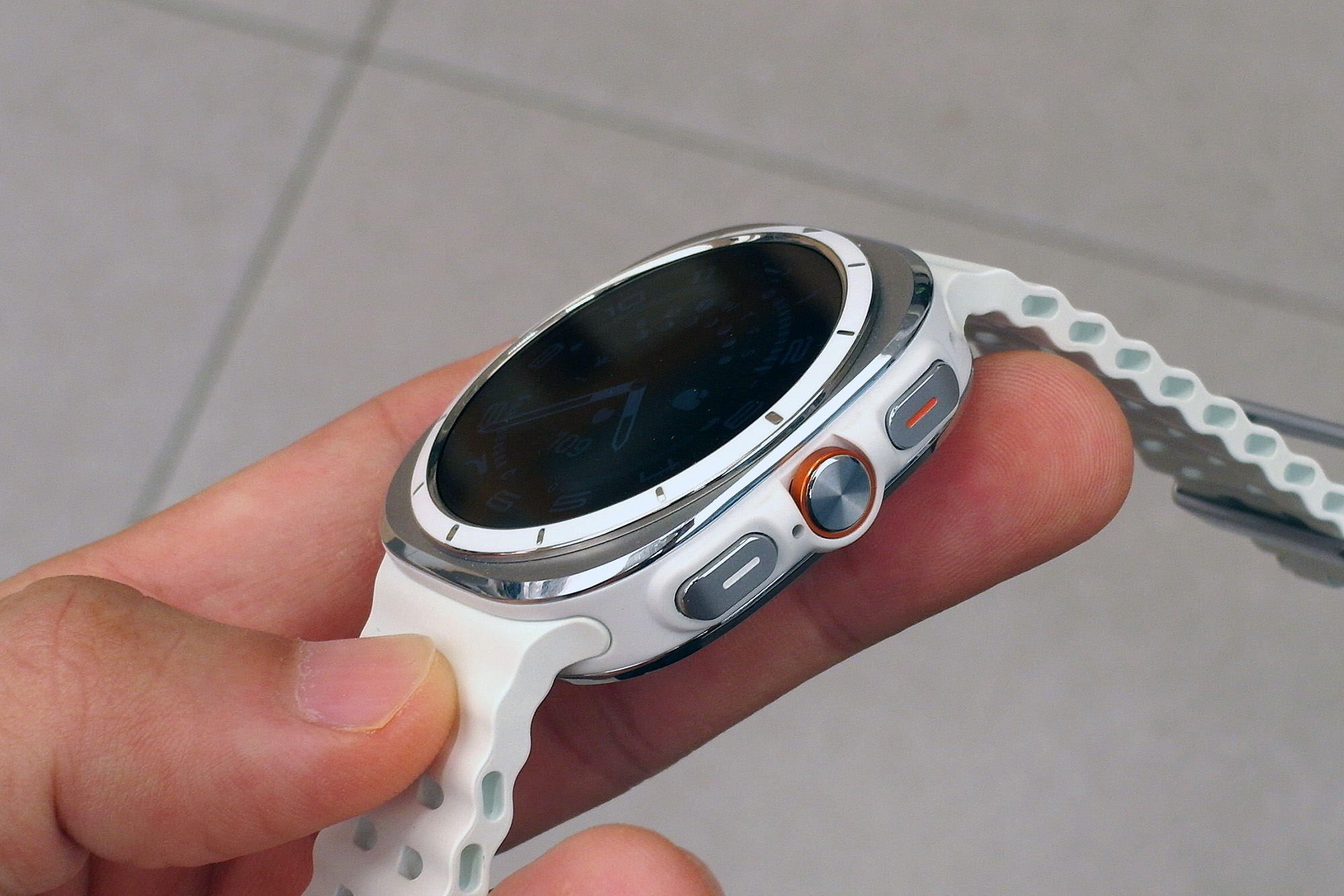 삼성 갤럭시 워치 울트라 티타늄 화이트 색상의 경우에는 전면에서 바라보았을 때는 나쁘지 않은 편이지만 옆면의 하얀색이 약간 거슬리는 느낌이었습니다. 차라리 은색으로 처리했다면 더 좋았을 것 같습니다.