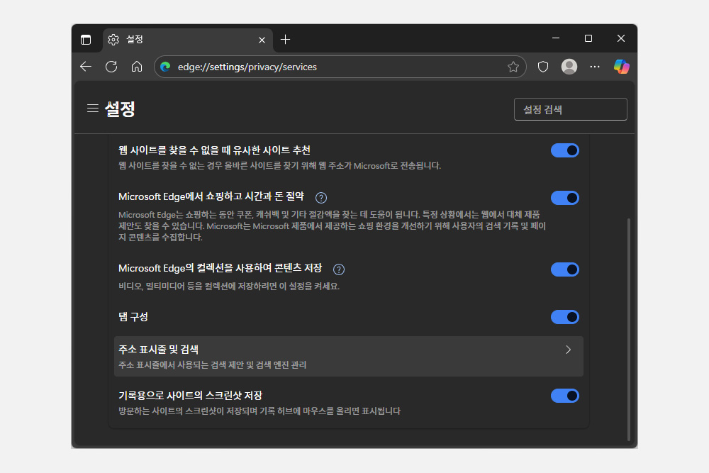 최근에 출시되는 웹 브라우저들은 주소 표시줄을 검색 엔진으로 활용할 수 있는 기능을 제공하고 있습니다. 마이크로소프트 엣지의 경우에는 기본적으로 빙으로 설정되어 있는데요. 검색 품질이 뛰어난 편은 아닙니다. 그래서 저는 네이버로 변경해서 사용하고 있고 있는데요. 변경 방법은 설정 > 개인정보, 검색 및 서비스 > 검색 및 연결된 경험 > 주소 표시줄 및 검색에서 검색 주소창에서 사용된 검색 엔진을 네이버(기본값)로 변경해 주면 됩니다.
