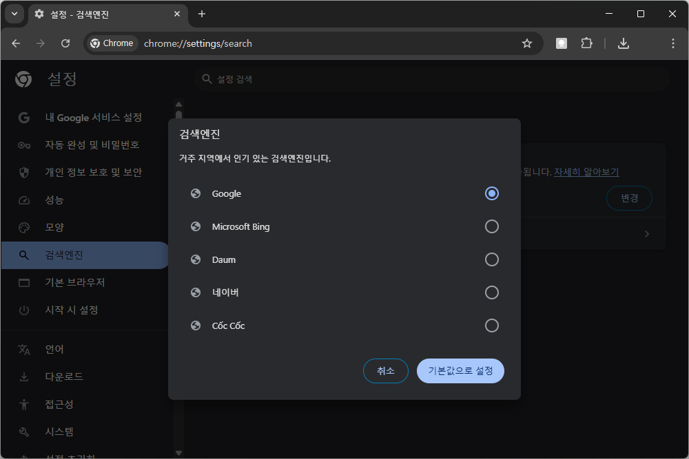 많은데요. 기본은 구글로 설정되어 있지만 다음이나 네이버 등으로 변경해서 상욯라 수 있습니다. 그리고 베트남 검색엔진인 꼭꼭(Cốc Cốc)을 지원한다는 점도 재미있는 부분입니다.