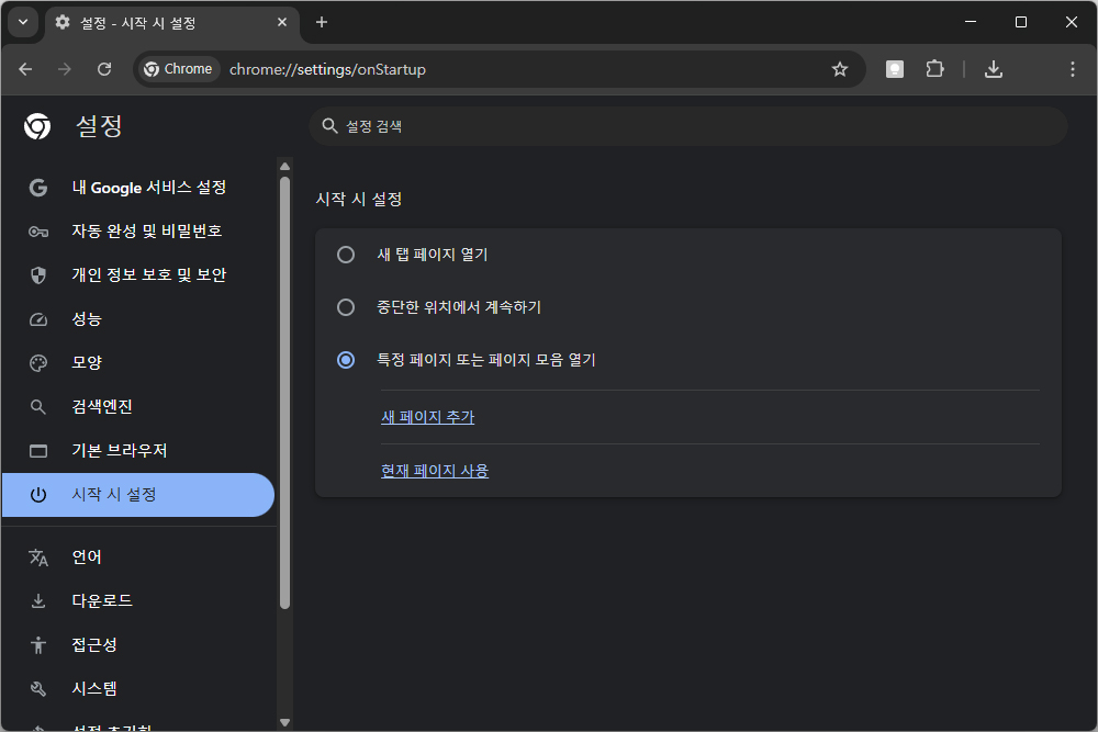 구글 크롬을 처음 실행했을 때 표시되는 홈페이지를 변경하기 위해서는 설정의 “시작 시 설정”을 변경해야 하는데요. 새 탭 페이지 열기와 중단한 위치에서 계속 그리고 특정 페이지 또는 페이지 모음 열기를 선택해주면 됩니다. 특히 매번 같은 페이지에 접속한다면 새 페이지 추가에서 해당 페이지를 넣어주면 됩니다.