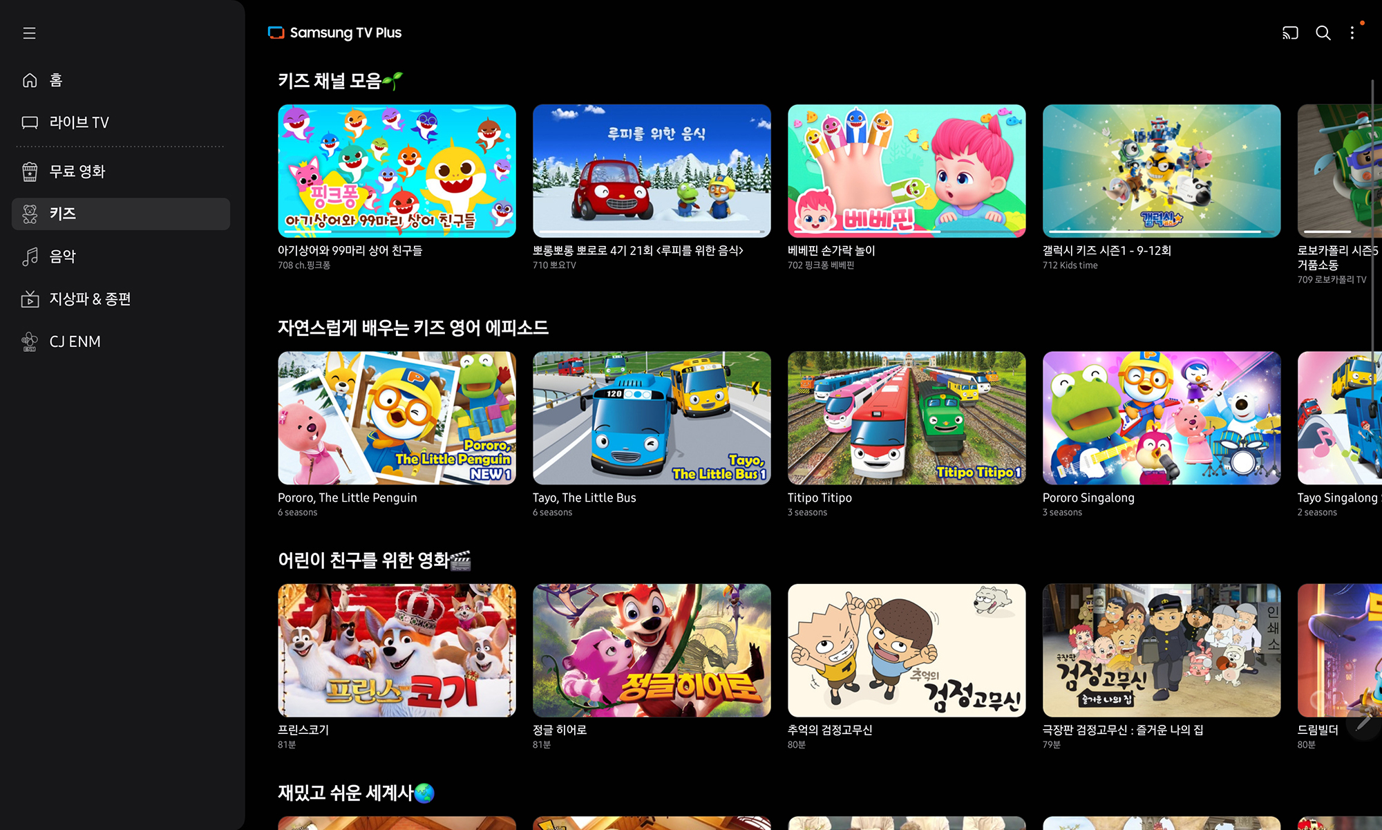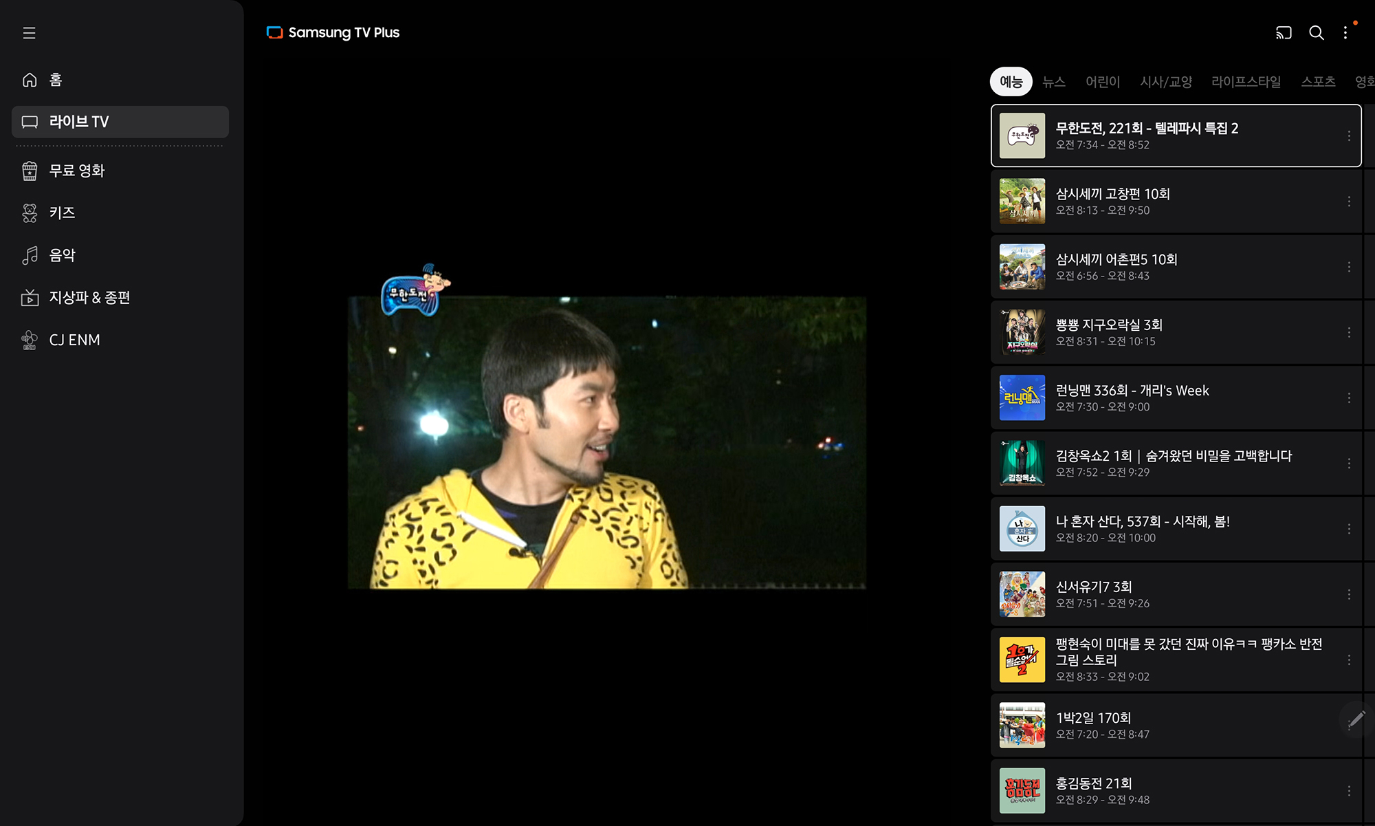 삼성 TV 플러스에는 은근히 다양한 콘텐츠를 제공하고 있는데요. 우선 라이브TV에서는 올타임 레전드인 “무한도전”과 “삼시새끼” 등이 서비스되고 있습니다. 그리고 무료영화와 함께 키즈 채널도 준비되어 있는데요. 특히 어린이들에게 태블릿으로 각종 콘텐츠를 보여줄 때 활용하면 좋을 것으로 예상합니다.