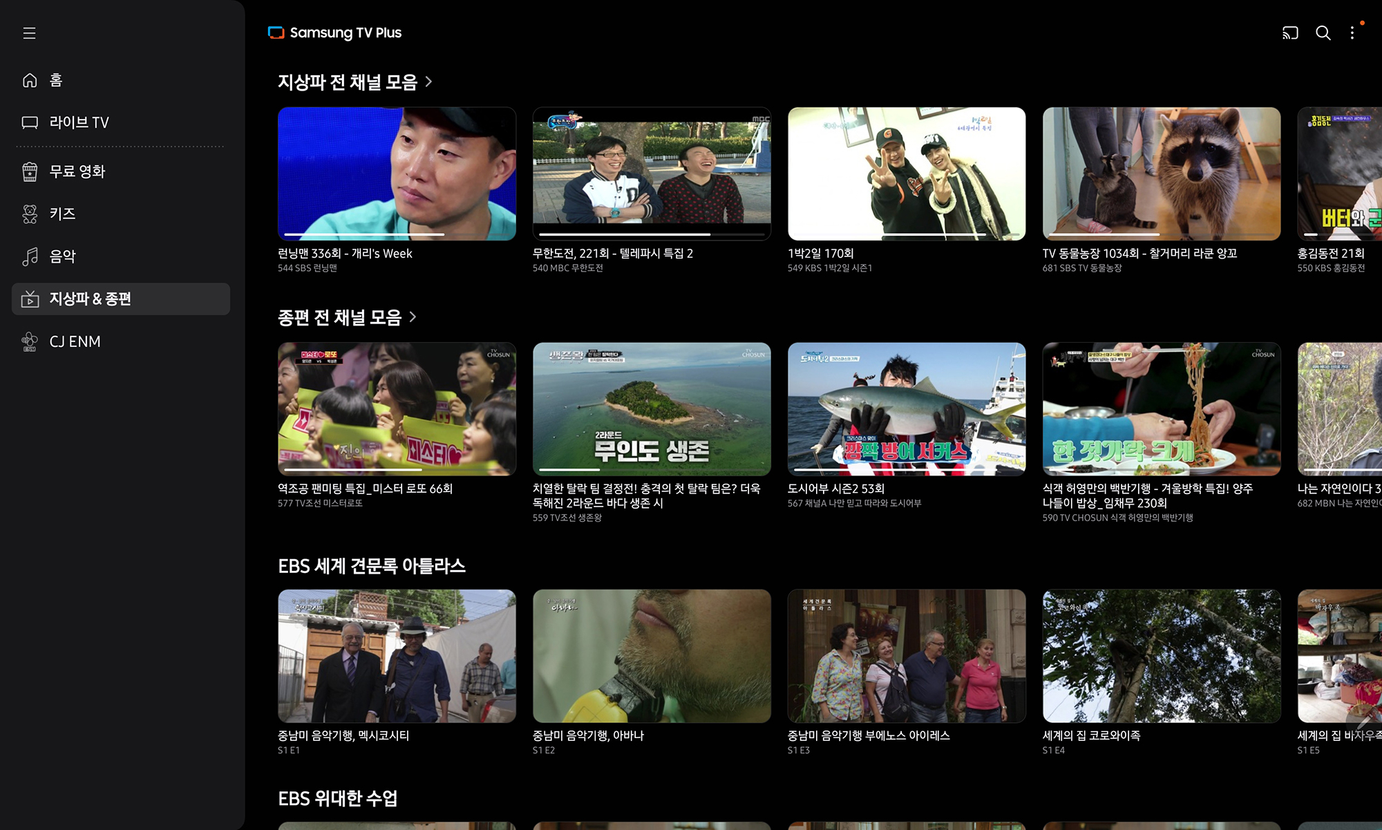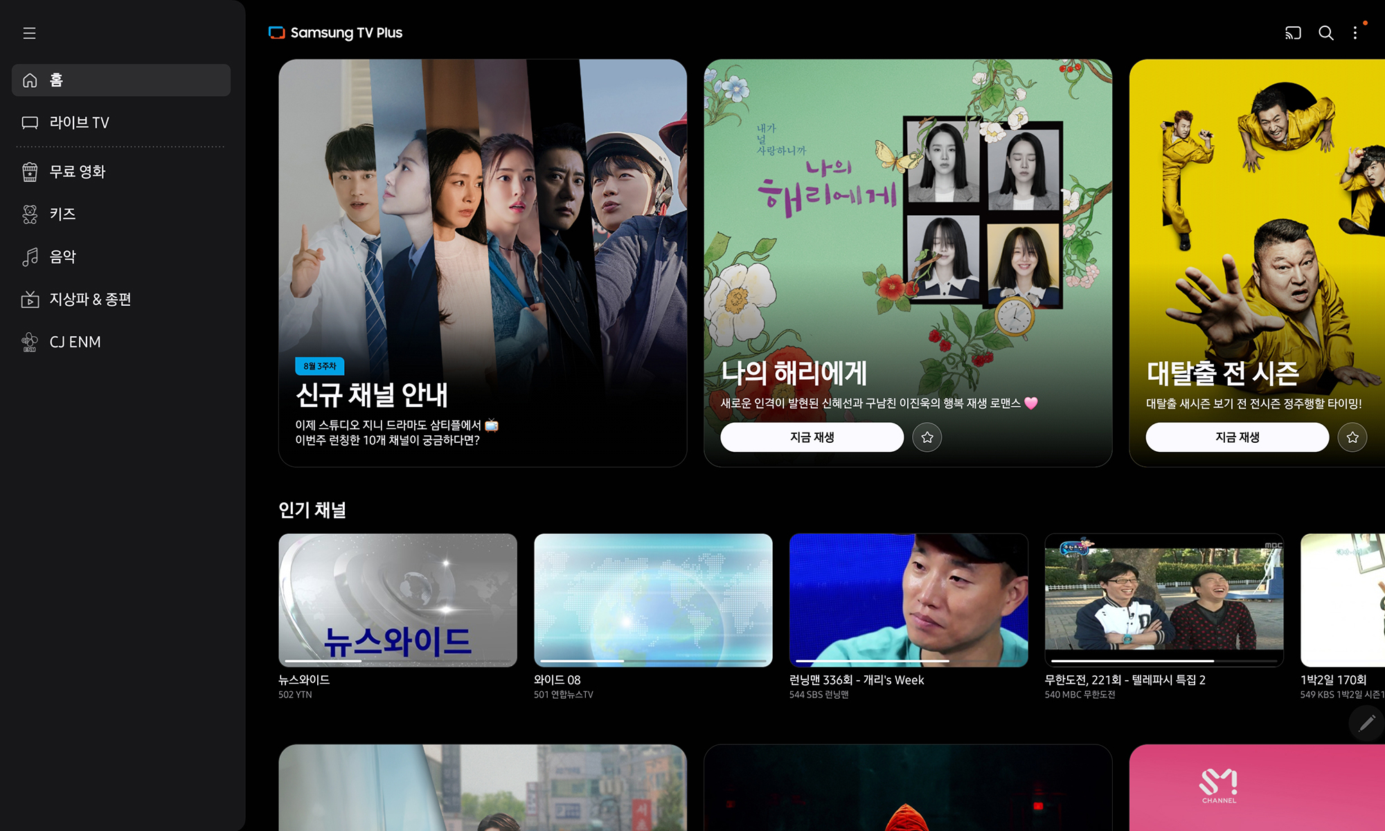 그 외에도 음악이나 지상파 & 종편 그리고 CJ ENM 관련 콘텐츠들도 서비스되고 있는데요. 심심할 때 고민 없이 시청하면 좋을 만한 콘텐츠들로 구성되어 있습니다. 그래서 스마트TV나 모니터를 이용해서 지속적으로 틀어놓는 용도로 활용해도 좋을 것 같습니다.