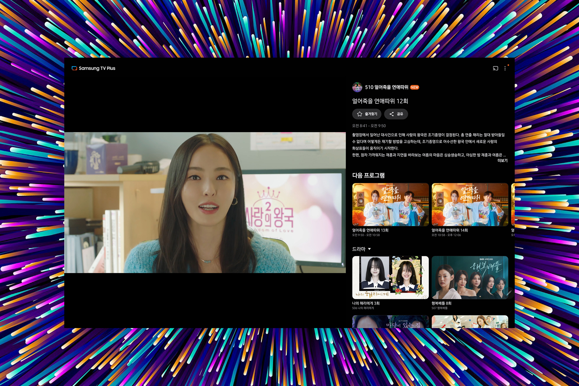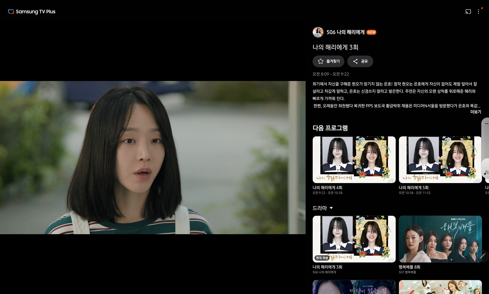 삼성 TV 플러스에서 서비스되는 KT Genie TV 오리지널 콘텐츠는 “나의 해리에게”, “얼어죽을 연애따위”, “야한 사진관”, “가우스전자”, “구필수는 없다”, 나미브“, ”유어 아너”, “마당이 있는 집”, “행복배틀” 등이 준비되어 있습니다. 그런데 아쉽게도 자신이 원하는 회차를 볼 수 있는 것은 아니고 실시간으로 합께 보기 형식으로 제공되고 있습니다.