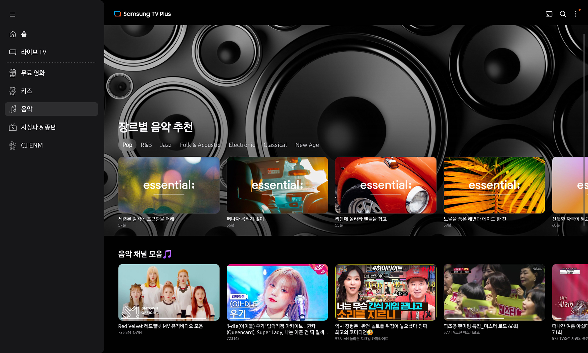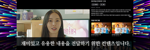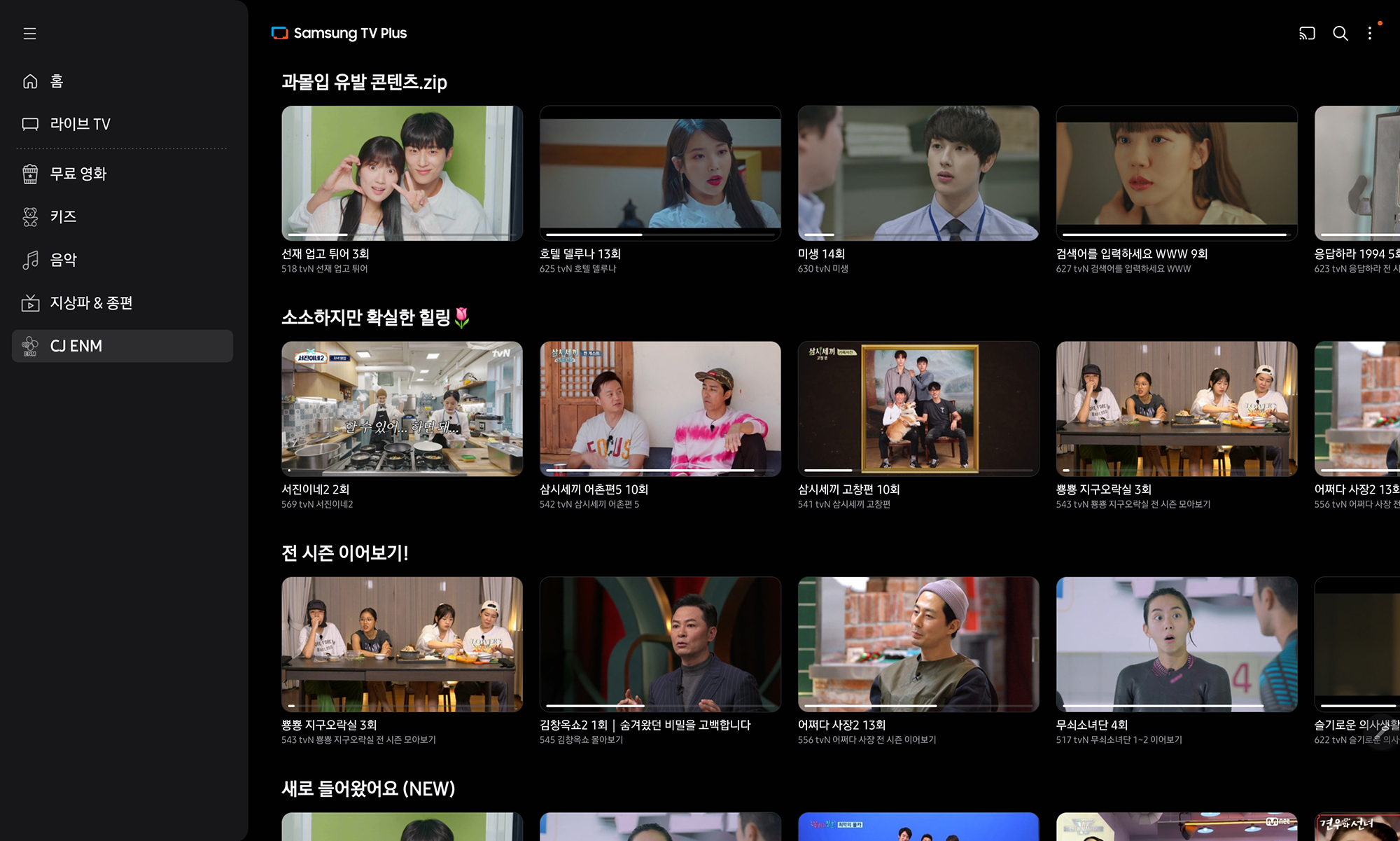그 외에도 음악이나 지상파 & 종편 그리고 CJ ENM 관련 콘텐츠들도 서비스되고 있는데요. 심심할 때 고민 없이 시청하면 좋을 만한 콘텐츠들로 구성되어 있습니다. 그래서 스마트TV나 모니터를 이용해서 지속적으로 틀어놓는 용도로 활용해도 좋을 것 같습니다.
