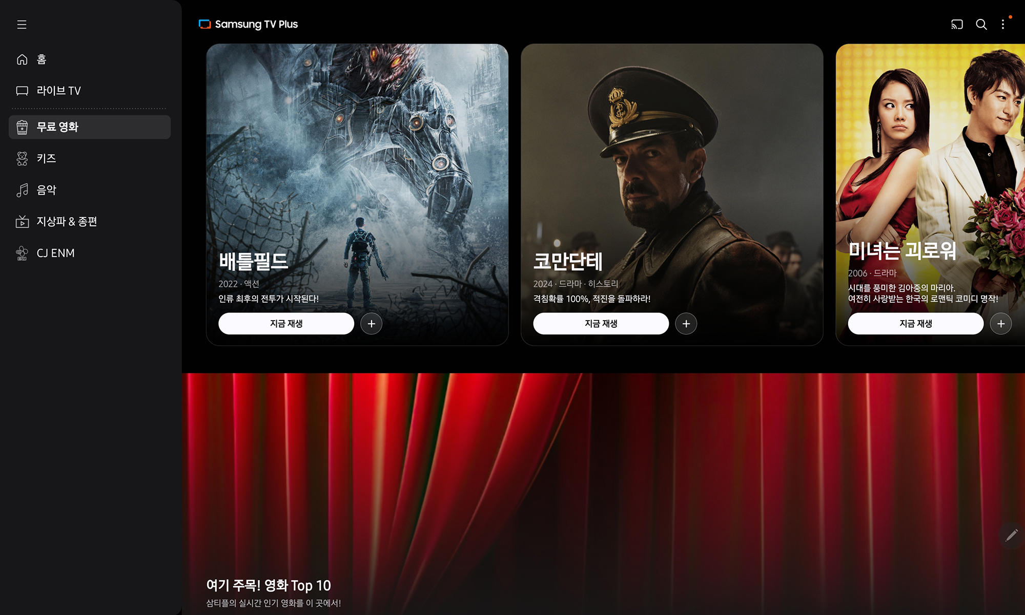 삼성 TV 플러스의 인터페이스는 위와 같은데요. 홈 화면에서는 현재 제공되는 콘텐츠의 종류가 표시되고 있는데요. 특히 8월 13일부터 서비스되고 있는 스튜디오 지니 드라마들이 안내되고 있는 것을 확인할 수 있습니다.