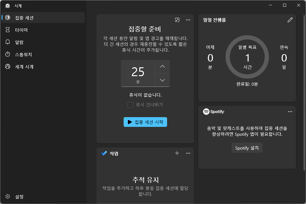그리고 재미있게도 집중 시간 중에 집중력에 도움이 되는 음악을 들을 수 있는 스포티파이(Spotify) 연결 기능도 제공하는데요. 별도의 윈도우 앱을 설치해서 사용하는 형태로 제작되었습니다. 그리고 스포티파이는 무료 광고 요금제로 사용해도 크게 상관없을 것 같습니다.