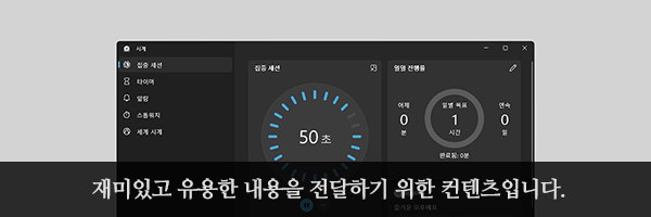 최근 컴퓨터 PC를 이용해서 인터넷 강의를 시청하거나 다양한 관련 자료를 확인하는 용도로 사용하는 경우가 많은데요. 이럴 때 집중력을 조금 더 높이기 위해서 일정 시간 동안 사용할 수 있는 타이머가 필요한 경우가 많은데요. 이럴 때 윈도우11 시계 앱을 한 번 사용해 보시는 것도 좋을 것 같습니다.