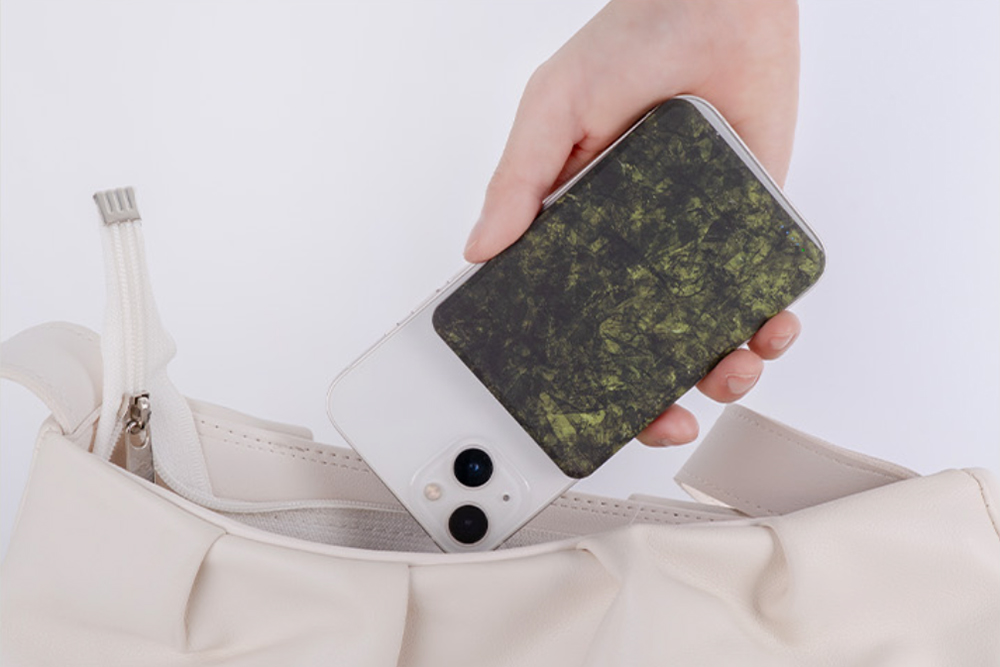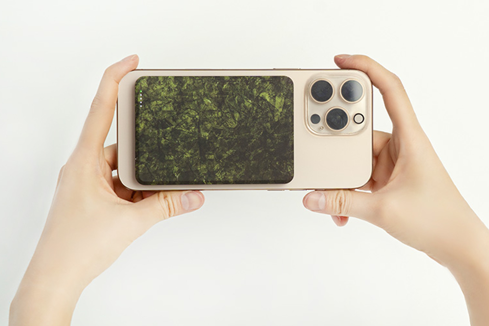 미니덕트 성경김 맥세이프 보조배터리는 실제 김 형태로 제작되었었는데요. 표면 패턴이 상당히 리얼하다는 것을 확인할 수 있습니다. 그리고 5,000mAh(19.25Wh) 용량의 리튬 폴리머 배터리가 내장되어 있습니다. 용량이 작은 편이어서 비행기 기내 반입도 큰 문제 없을 것 같습니다. 참고로 크기는 6.85 x 9.95 x 0.79cm이고 무게는 103g입니다.