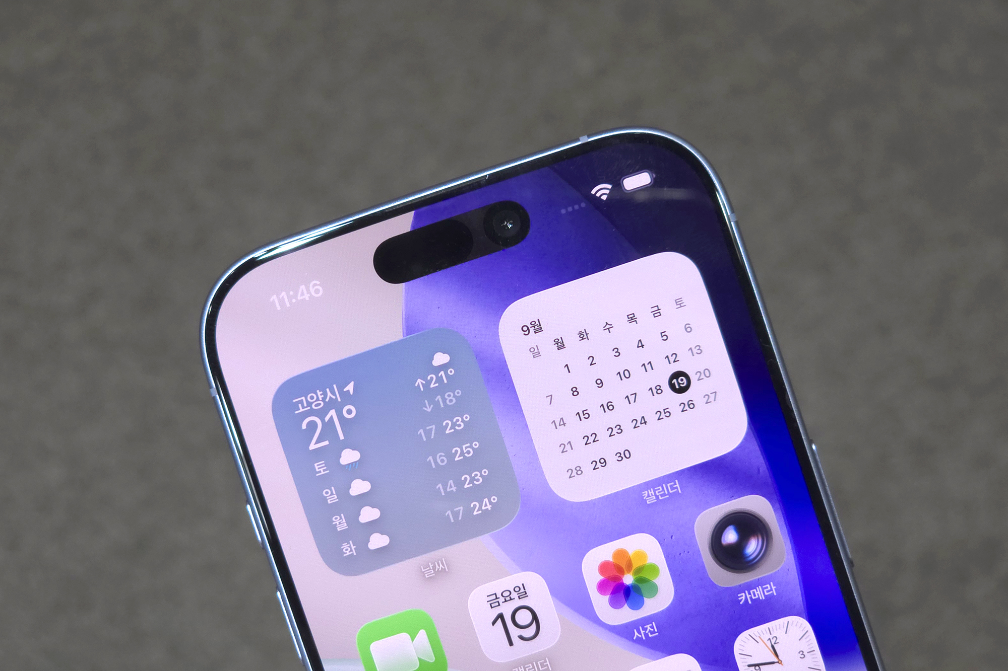 화면의 상단에는 역시 다이내믹 아일랜드가 탑재되었는데요. 최신 아이폰 시리즈는 모두 통일성을 가지고 있습니다. 앞으로 몇세대 후의 제품은 점차 크기가 줄어드는 방향으로 발전할 것이라고 하는데요. 페이스 아이디 때문에 유지되고 있기는 하지만 화면을 바라 볼 때 불편한 것은 사실입니다.