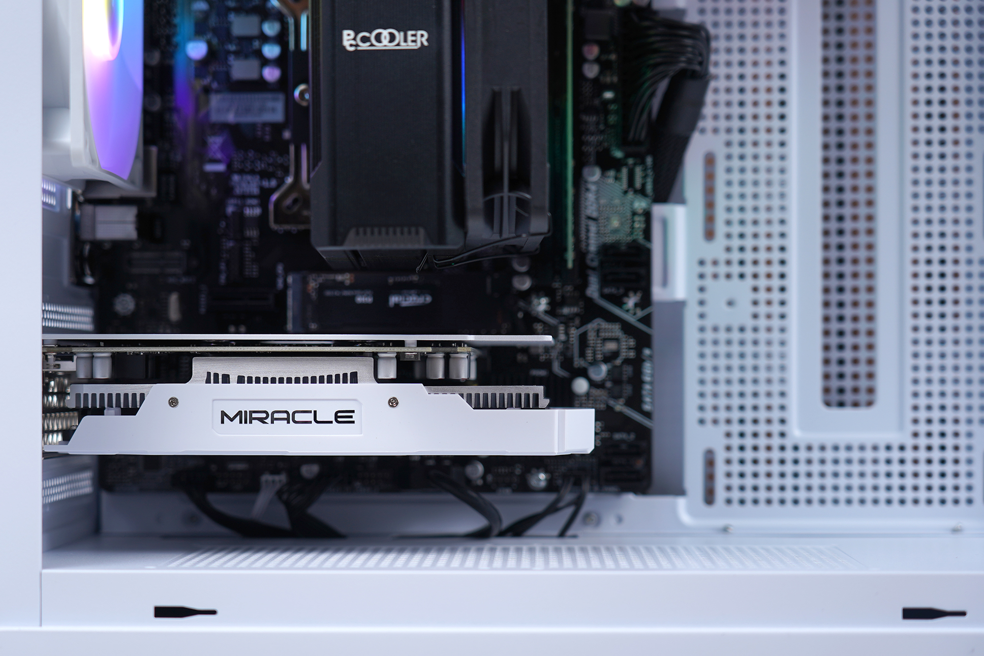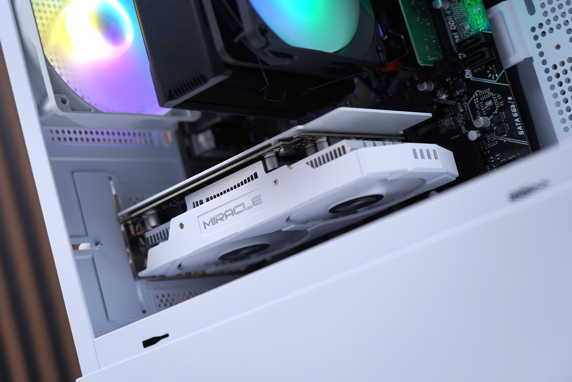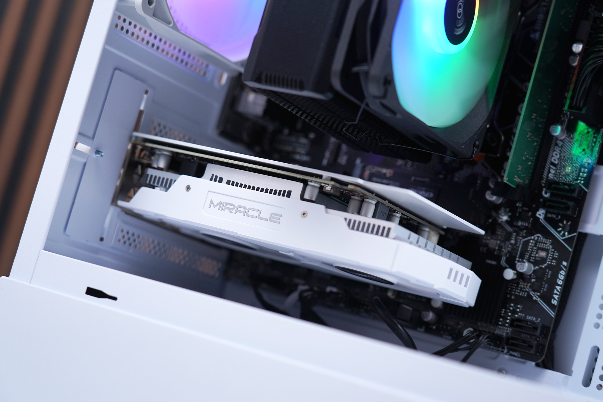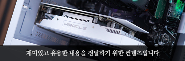 이엠텍 RTX 3050 MIRACLE 그래픽카드를 실제로 컴퓨터에 장착해 보면 위와 같은 모습인데요. 전체 길이가 187mm로 짧은 편이어서 콤팩트한 크기의 케이스에도 크게 불편함 없이 장착할 수 있을 것으로 예상합니다.