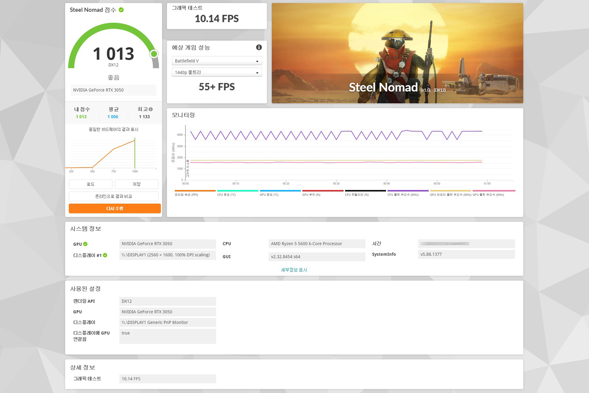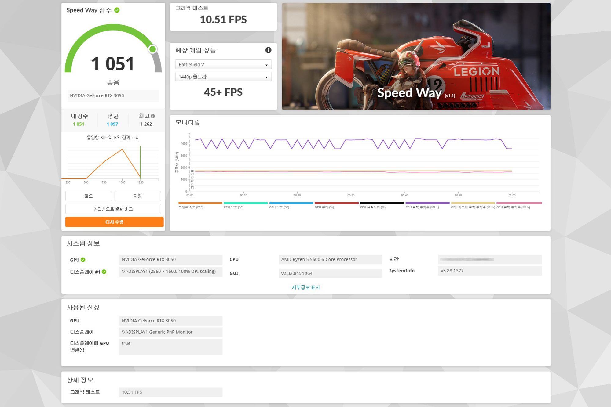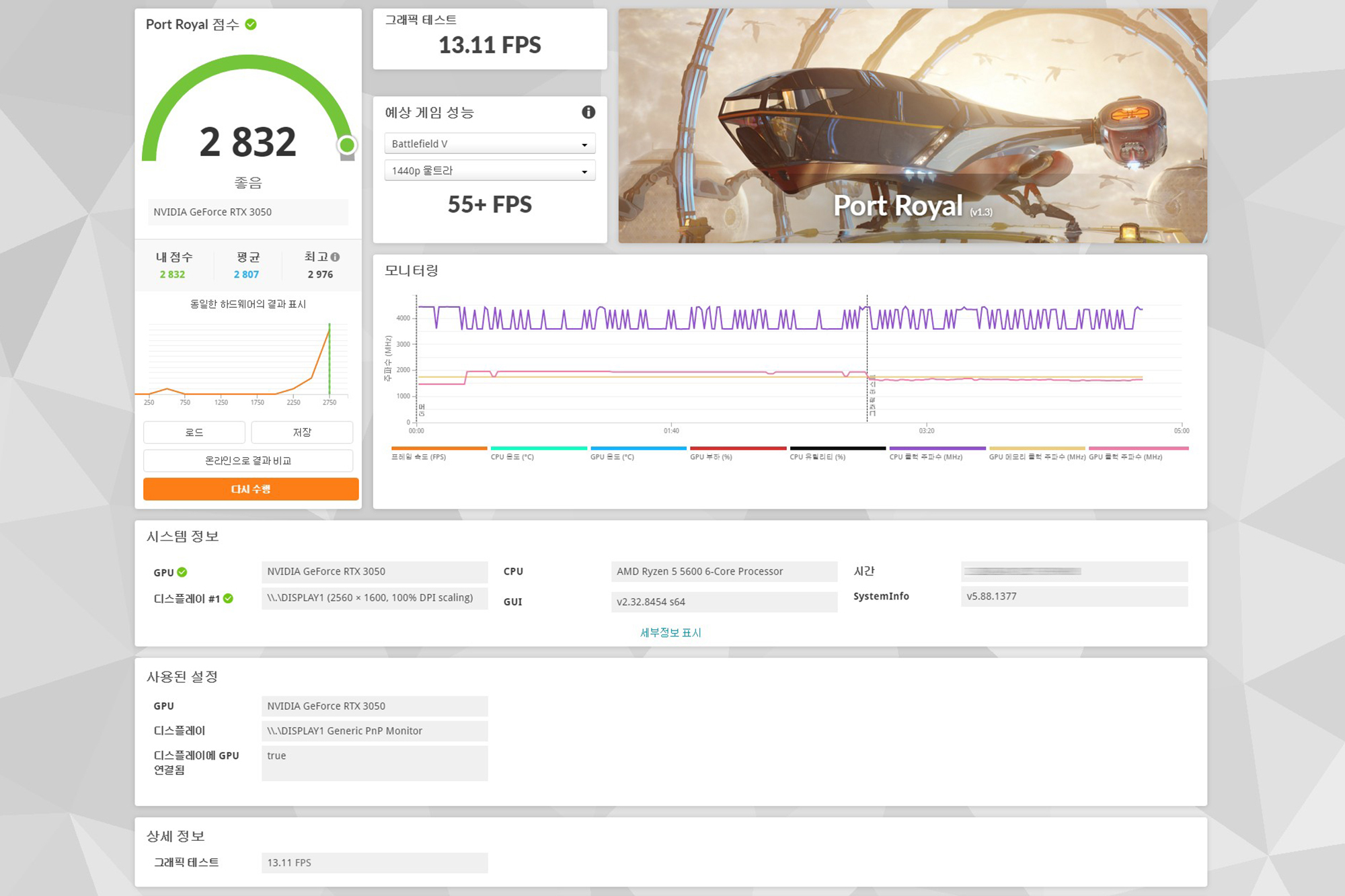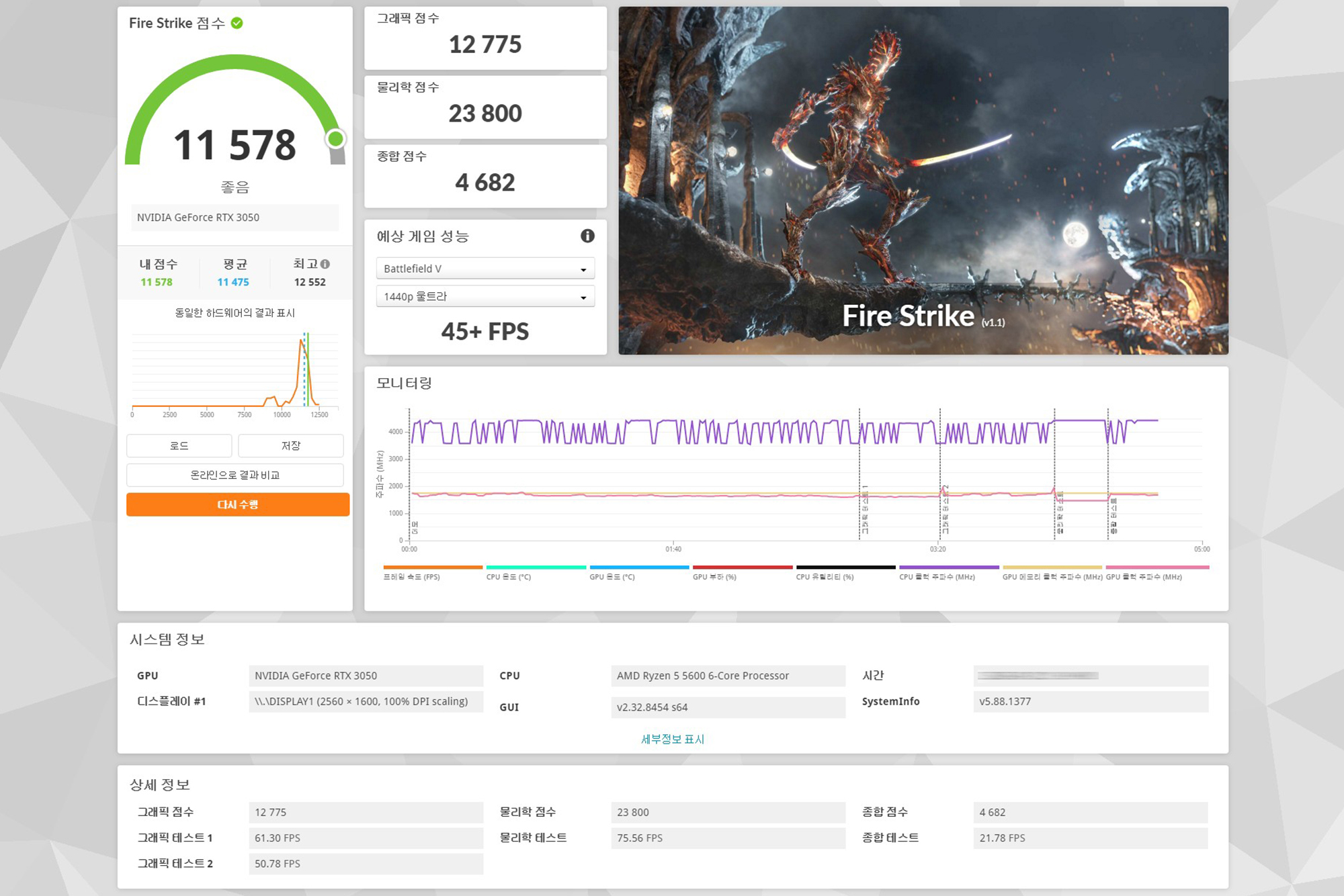 3DMARK 벤치마크 프로그램을 이용해서 이엠텍 RTX 3050 MIRACLE 그래픽카드의 성능을 확인해 보면 파이어 스트라이크(Fire Strike)는 11,578점, 타임 스파이(Time Spy)는 5,084점, 포트 로얄(Port Roayl)은 2,832점, 스틸 노마드(Steel Nmad)는 1,013점, 스피드 웨이(Speed Way)는 1,051점으로 측정되었습니다.