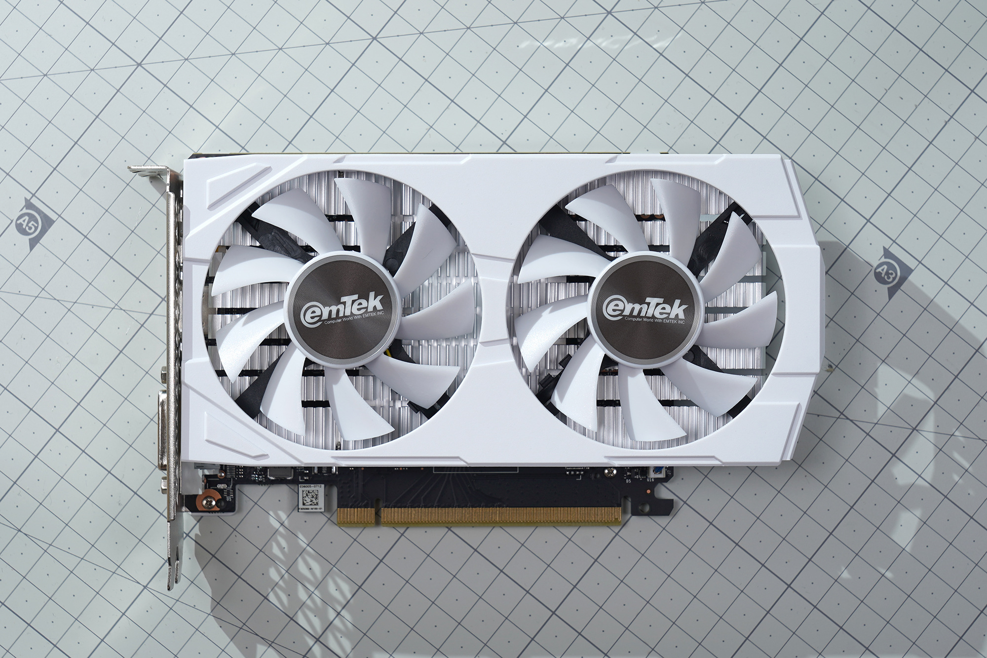 이엠텍 RTX 3050 MIRACLE 그래픽카드의 디자인을 살펴보면 화이트 컬러가 적용되어서 화이트 색상으로 시스템을 꾸민 분들에게 적합합니다. 그리고 전면에는 2개의 75mm 팬이 탑재되었는데요. 아쉽게도 특정 온도 이하에서는 쿨링팬이 동작하지 않는 제로팬 기능은 탑재되지 않았습니다.