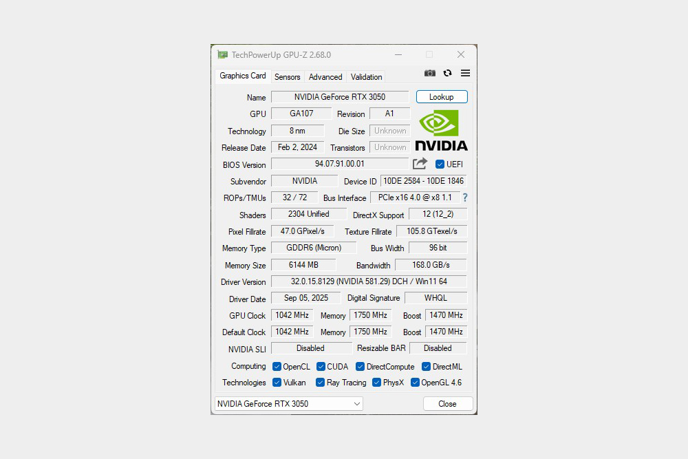 이엠텍 RTX 3050 MIRACLE 그래픽카드의 정보를 GPU-Z를 통해서 확인해 보면 GPU는 GA107이고 2,304 쿠다코어와 1,470mHz 부스트 클럭의 속도를 제공한다는 것을 확인할 수 있습니다. 그리고 메모리는 GDDR6 6GB입니다.