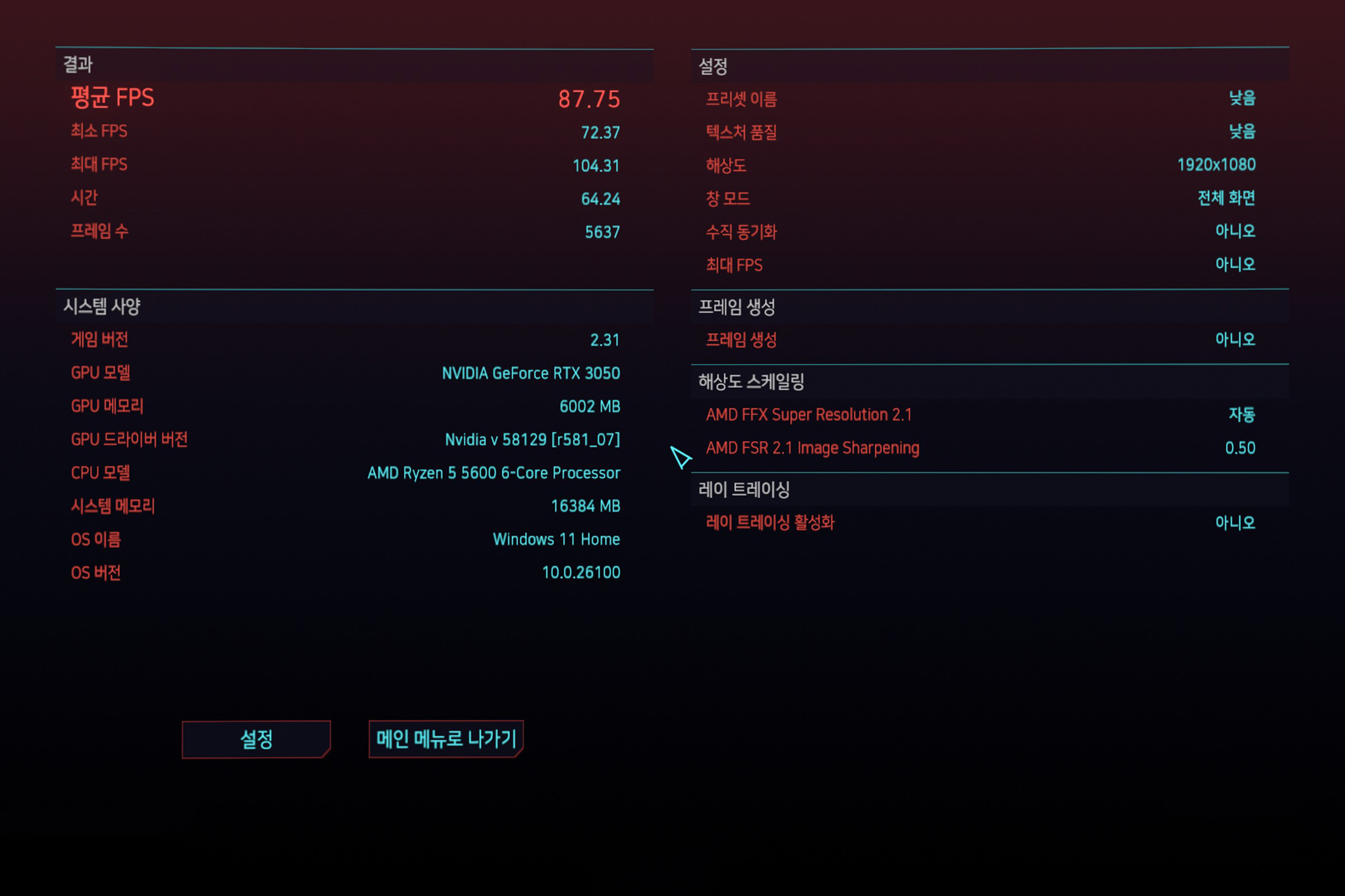 사이버 펑크 2077을 통해서 게임 프레임을 확인해 보면 FULL HD(1920 x 1080)해상도에서 프리셋을 낮음으로 설정했을 때는 약 87프레임이 측정되었고 레이트리싱:낮음에서는 42프레임이 측정되었습니다. FHD에서 옵션을 조절한다면 웬만한 게임들은 플레이 자체에 문제는 없을 것으로 보입니다.