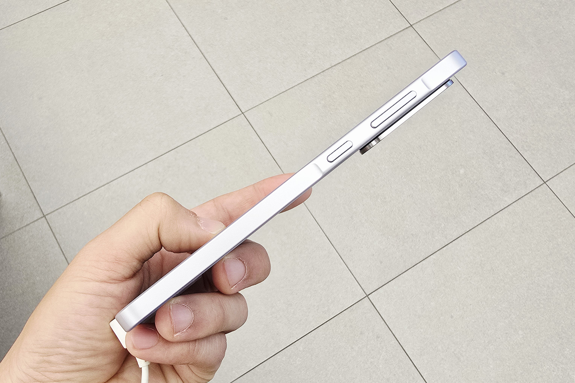 갤럭시 A36 5G의 두께는 7.4mm로 슬림한 펴이고 무게는 195g으로 무난한 편입니다. 그리고 옆면의 볼륨과 전원 버튼이 부분이 약간 돌출되어 있다는 점이 독특한 부분이라고 생각되었습니다.