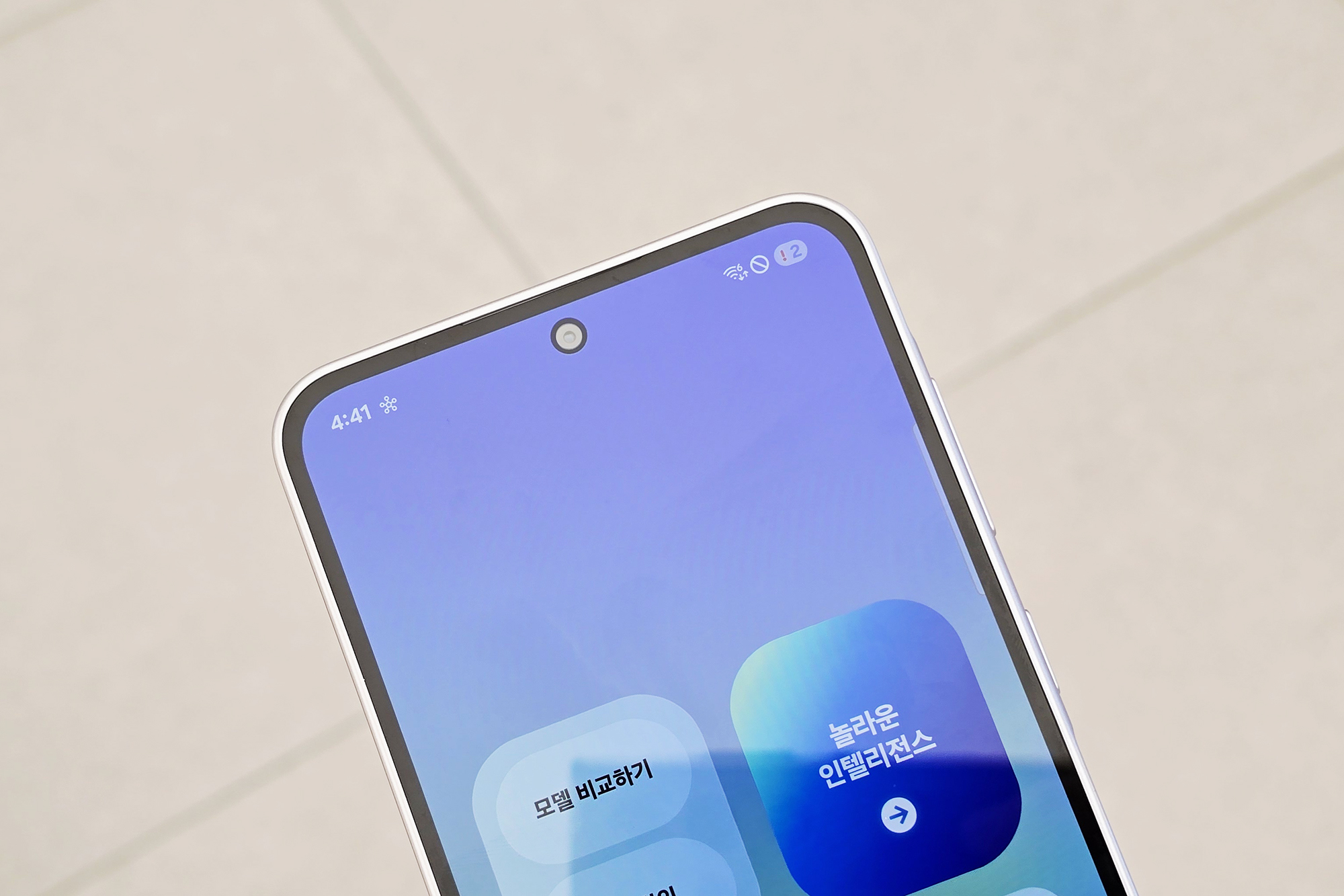 갤럭시 A36 5G의 디스플레이는 펀치 홀 형태로 제작되었고 안쪽에 12MP F2.2 전면 카메라가 배치되어 있습니다. 화질은 무난할 것으로 예상되지만 플래그십 스마트폰과 비교하면 상당히 부족할 수 있습니다.