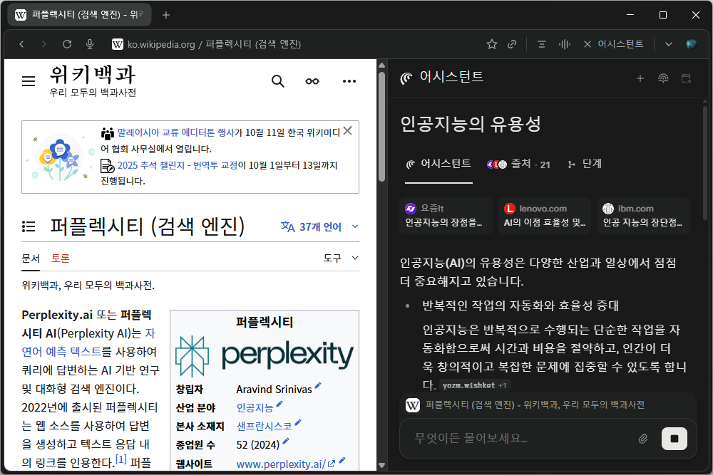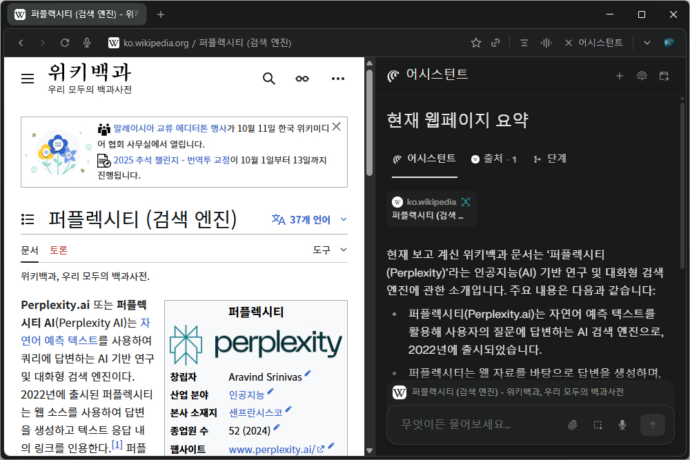 퍼플렉시티 코멧 브라우저는 웹서핑과 인공지능을 동시에 사용할 수 있는 기능을 제공하는데요. 기본적으로 웹 페이지를 요약하는 기능은 물론이고 어시스턴트 기능을 통해서 추가적인 질문이 가능합니다. 필요에 따라서 활용도를 높일 수 있을 것으로 예상합니다.