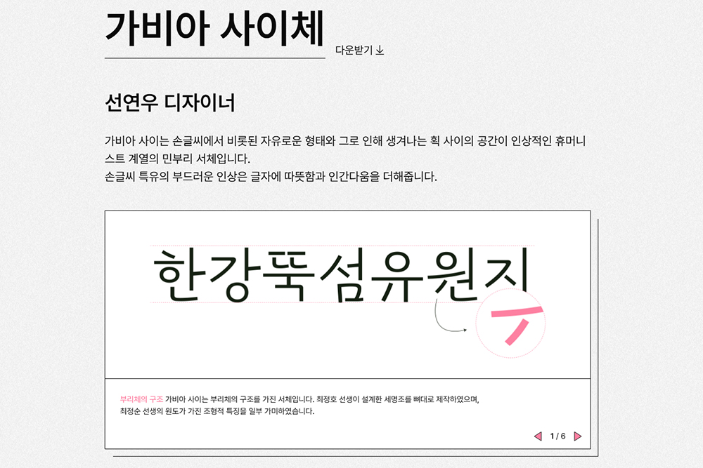 가비아 사이체도 역시 홍익대학교의 조영재 디자이너가 제작을 맡았는데요. 손글씨와 유사한 느낌을 주는 편이어서 자유로운 본문에 사용하면 좋을 만한 폰트라고 생각되었습니다. 두 개의 폰트를 엮어서 하나의 콘텐츠를 만들어도 좋을 것으로 예상합니다.