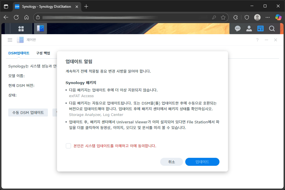 그리고 최신 DSM 관련 메시지가 표시되는데요. exFAT Access가 더 이상 지원되지 않고 몇 가지 패키지가 자동으로 업데이트된다는 메시지가 표시됩니다. 그리고 DSM 업데이트는 자신의 NAS 사양에 따라서 다르지만 10 ~ 20정도 시간이 소요될 수 있습니다.