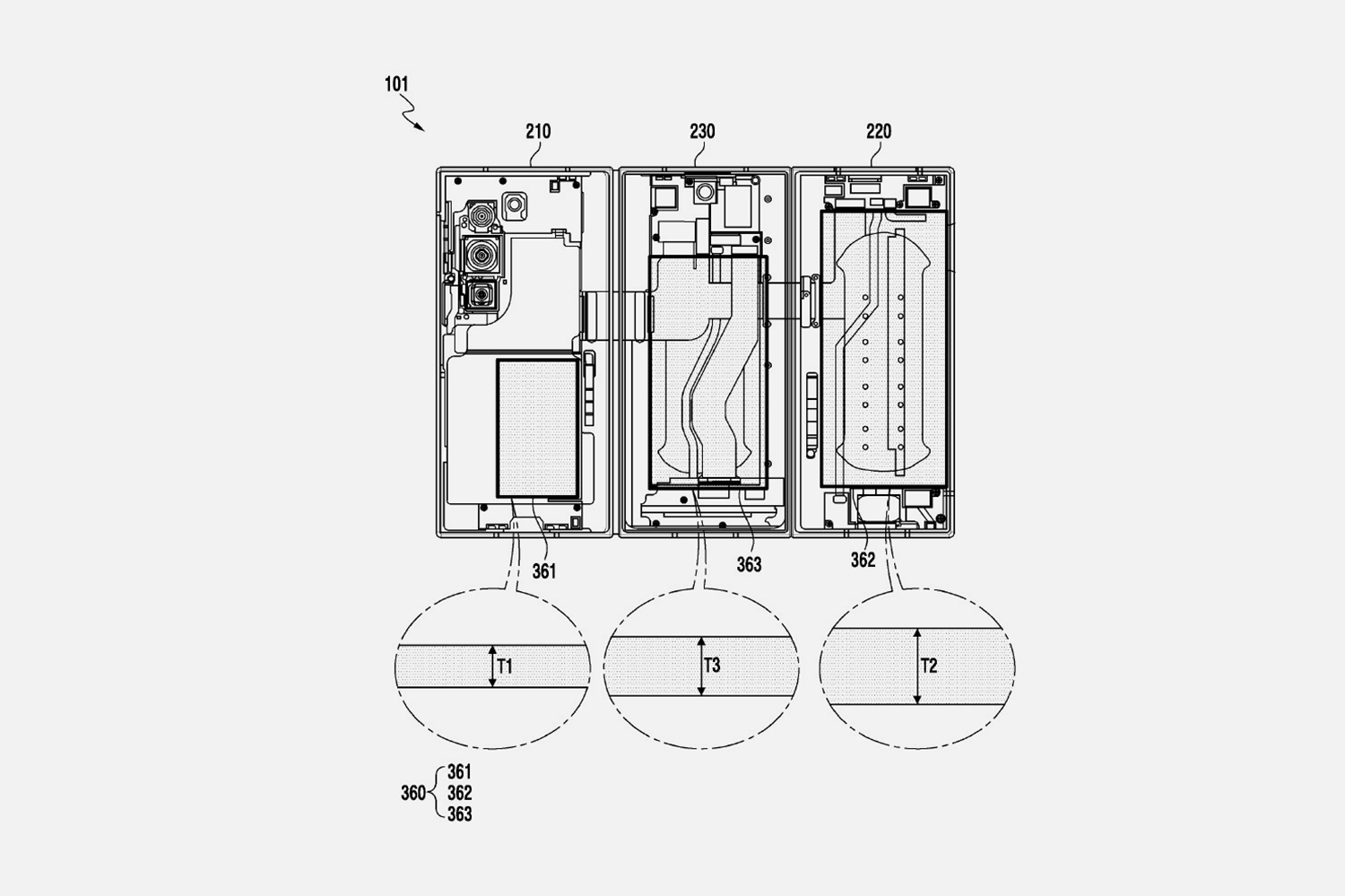 이번에 유출된 삼성 갤럭시Z 트라이폴드폰의 특허 관련 내용을 살펴보면 3개의 화면에 모두 배터리가 탑재된 것을 확인할 수 있는데요. 구조에 따라서 크기와 형태가 다른 것을 확인할 수 있습니다. 기존의 갤럭시Z 폴드7이 2개에 4,400mAh 용량이었던 것을 생각해 보면 5,000mAh 이상이 될 가능성이 있다고 합니다.