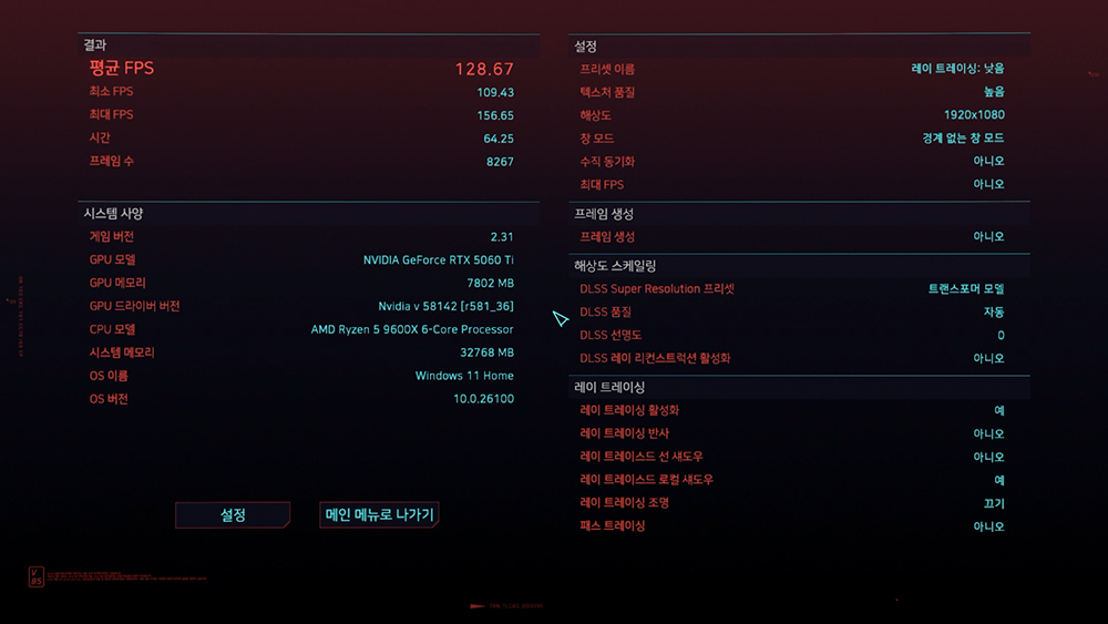 게임을 통해서 MSI RTX 5060 Ti 벤투스 그래픽카드의 성능을 가늠해 보면 사이버펑크 2077에서는 레이 트레이싱:낮음 프리셋과 FULL HD 해상도에서는 평균 128.67프레임, 4K 해상도에는 평균 60.36프레임이 측정되었습니다. 4K 해상도에서도 어느 정도 플레이가 가능한 것을 확인할 수 있습니다.