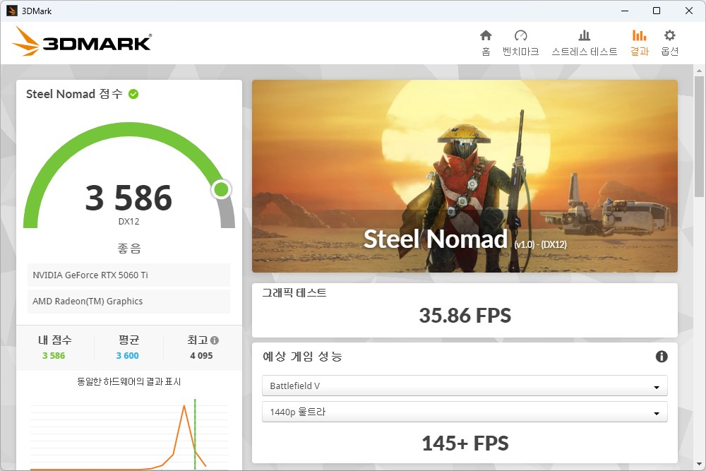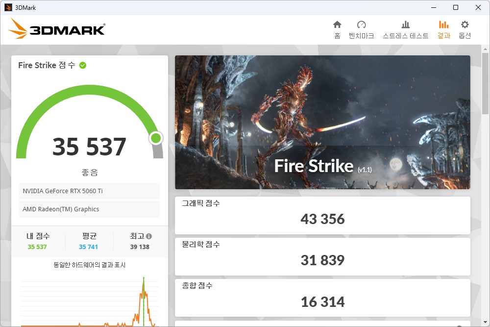 3DMARK를 이용해서 MSI RTX 5060 Ti 벤투스 그래픽카드의 성능을 확인해 보면 파이어 스트라이크(Fire Strike)는 35,537점, 타임 스파이(Time Spy)는 14,572점, 포트 로얄(Port Royal)은 10,076점, 스틸 노마드(Steel Nomad)는 3,586점, 스피드 웨이(Speed Way)는 4,122점으로 측정되었습니다.