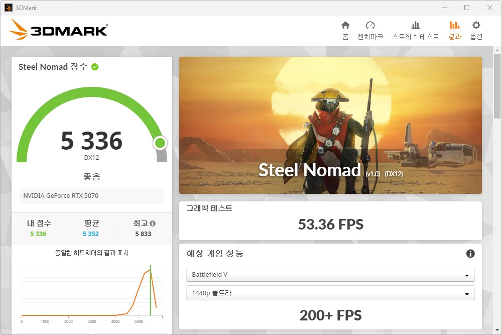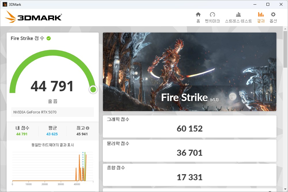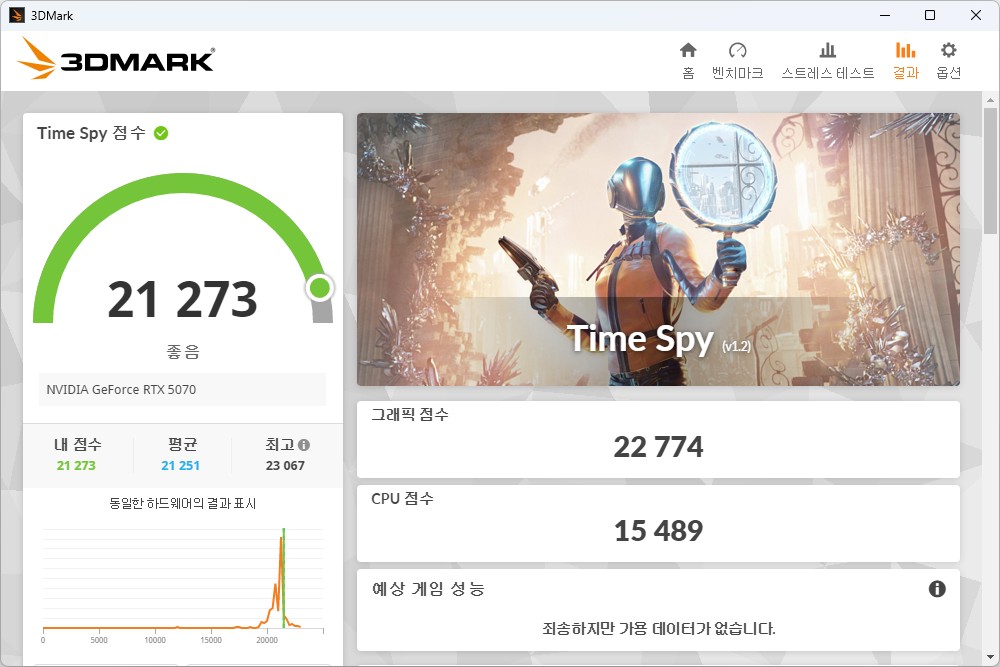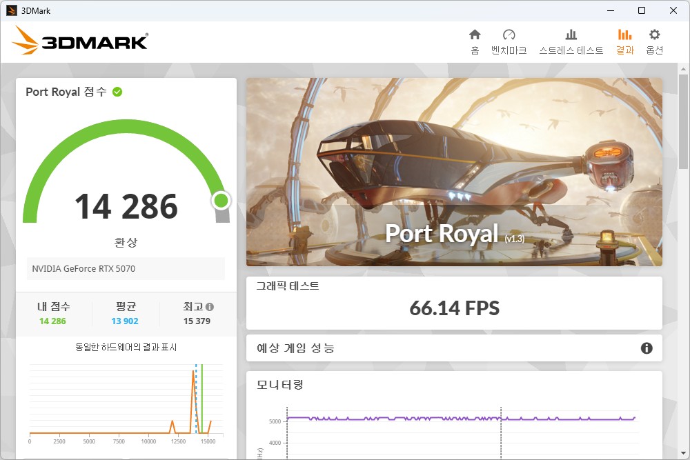 대표적인 그래픽카드 벤치마크 프로그램인 3DMARK를 이용해서 만리 RTX 5070 북극여우 그래픽카드의 성능을 살펴보면 파이어 스트라이크(Fire Strike)는 44,791점, 타임 스파이(Time Spy)는 21,273점, 포트 로얄(Port Royal)은 14,286점, 스틸 노마드(Steel Nomad)는 5,336점, 스피드 웨이(Speed Way)는 5,946점으로 측정되었습니다.