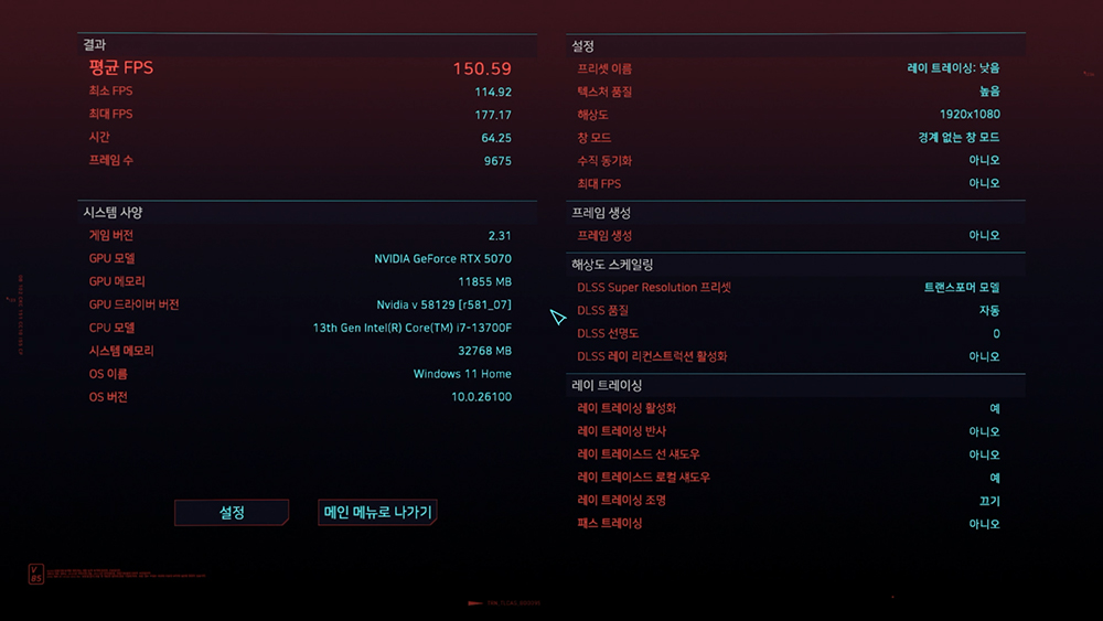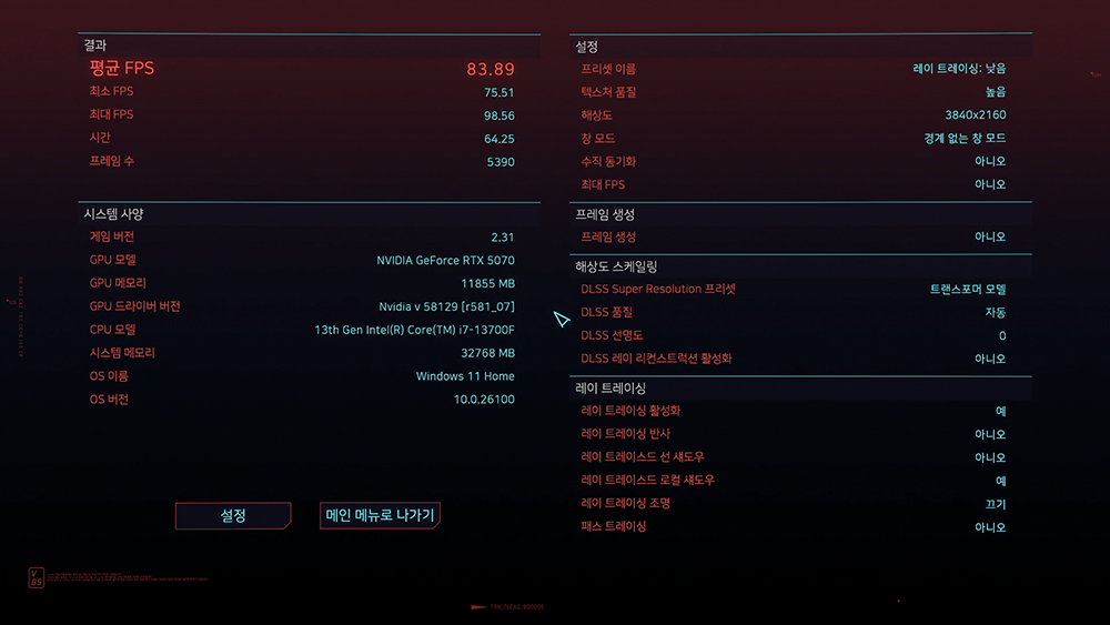 이번에는 3D 게임을 통해서 만리 RTX 5070 북극여우 그래픽카드의 성능을 확인해 보면 사이버펑크 2077의 경우에는 레이 트레이싱: 낮음 프리셋에서 테스트를 진행했는데요. FULL HD 해상도에서는 평균 150.59프레임, 4K 해상도에서는 83.89프레임이 측정되었습니다.