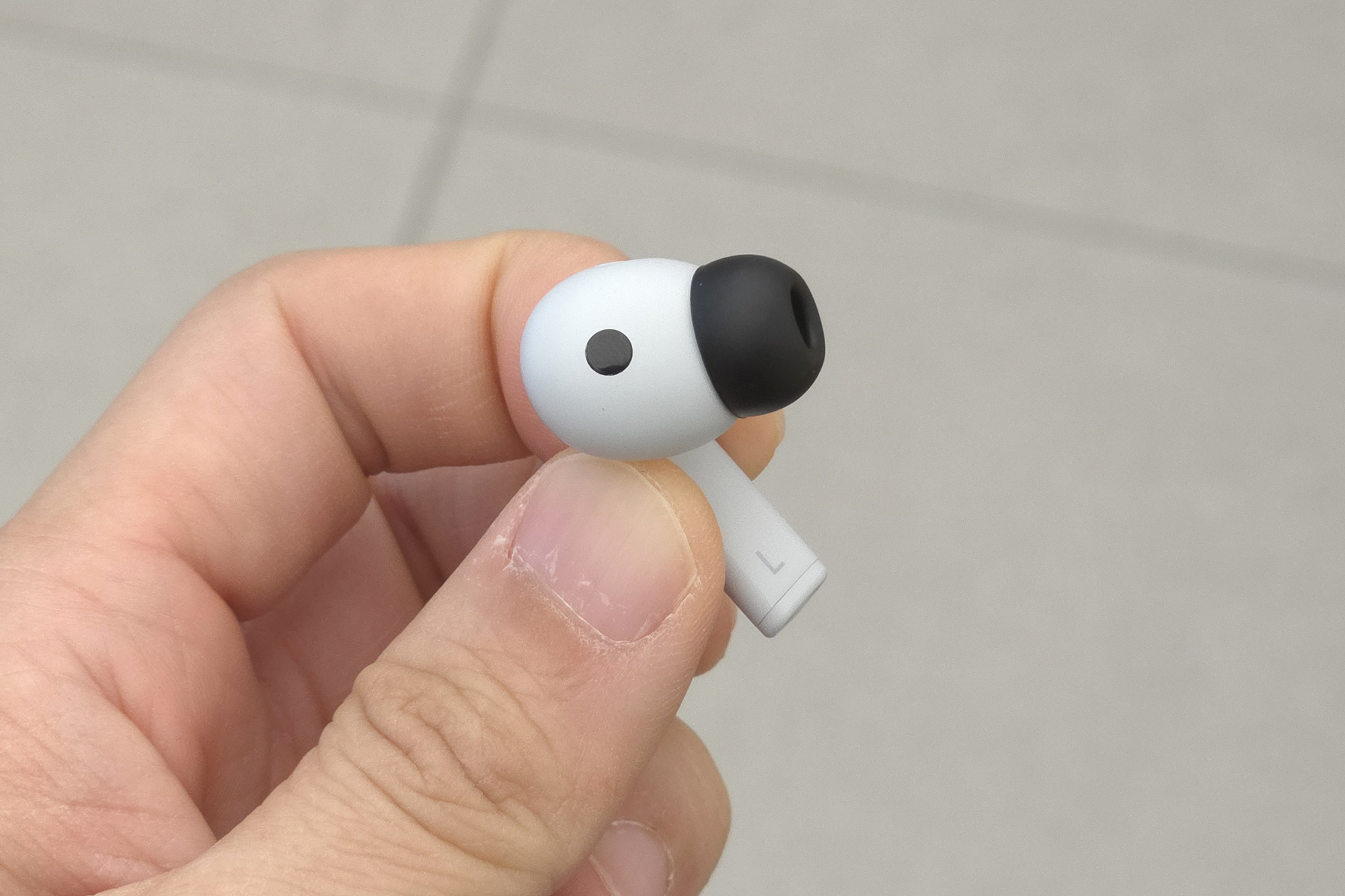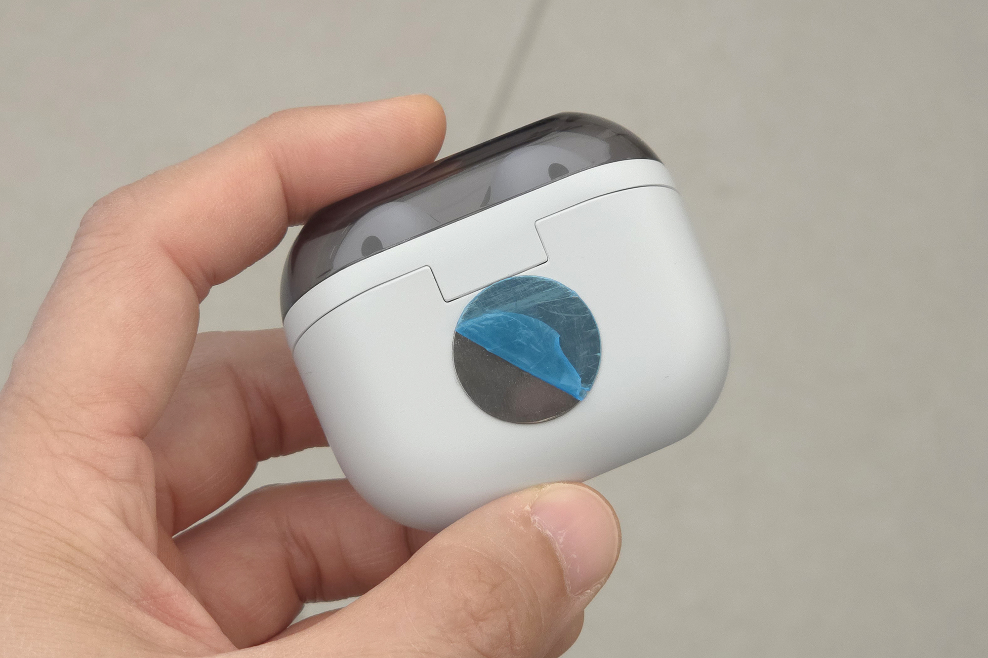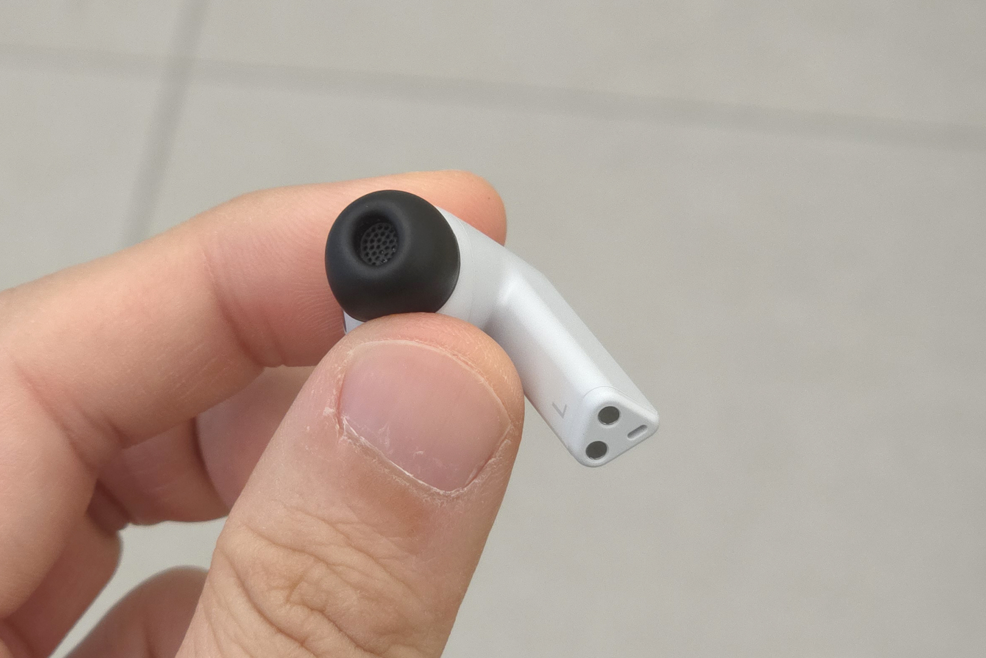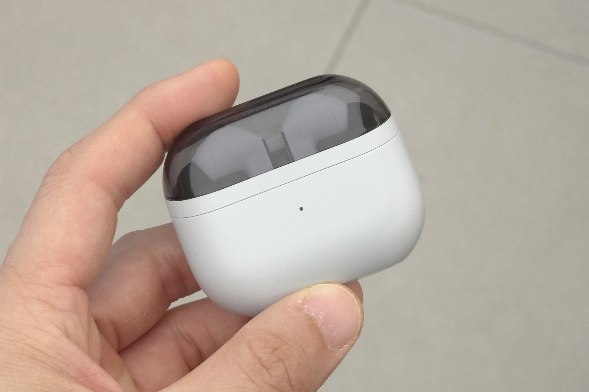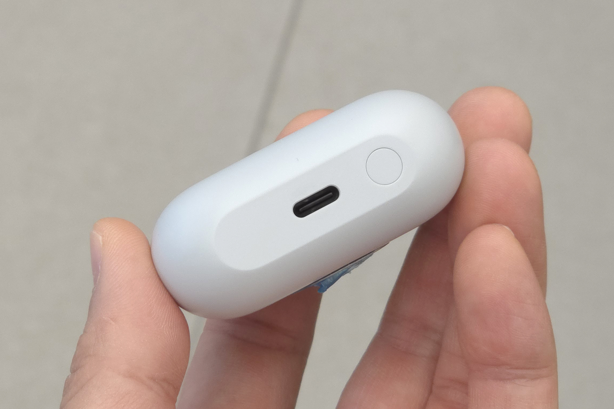 바닥을 살펴보면 충전을 위한 USB-C 포트와 함께 페어링 버튼이 준비된 것을 확인할 수 있습니다. 참고로 충전 케이스와 함게 사용하면 ANC가 켜진 상태에서 최대 24시간 음악을 들을 수 있습니다.