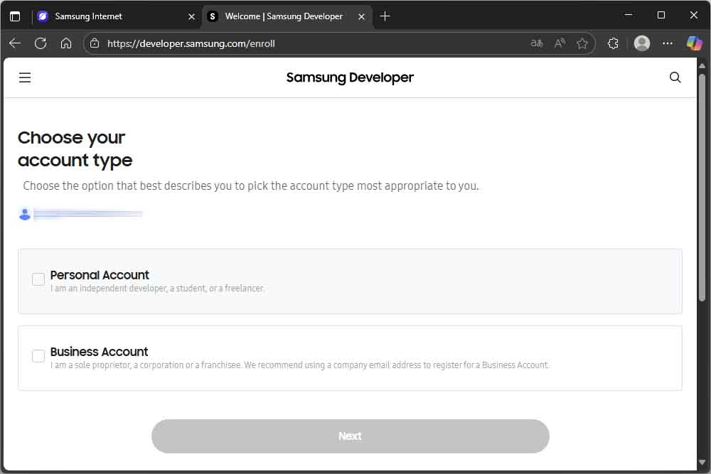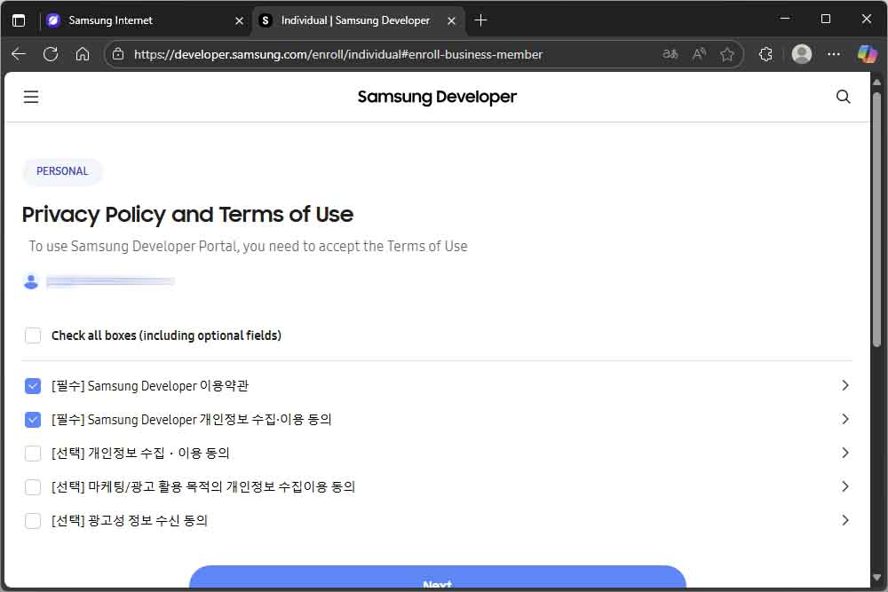 다음에는 삼성 계정으로 로그인해야 하는데요. 이때 삼성전자의 스마트폰이나 태블릿이 필요할 수 있습니다. 그리고 삼성 개발자 포털에 가입해야 하는데요. 개인 계정을 선택하고 몇 가지 옵션을 선택하면 삼성 인터넷 브라우저 PC 버전의 설치 파일을 다운로드 받을 수 있습니다.
