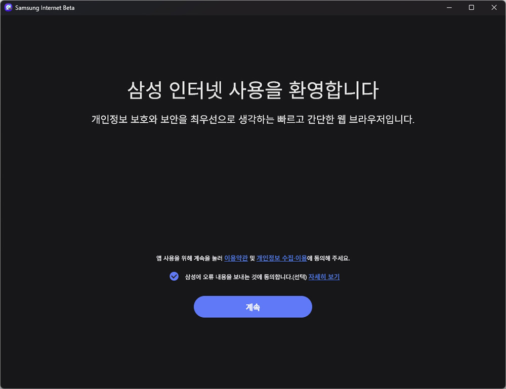 설치가 완료되면 초기 설정 과정에 들어가는데요. 삼성 인터넷 브라우저 PC 버전을 사용하다가 발생하는 오류를 삼성과 공유할 것인지에 대한 옵션을 선택할 수 있습니다.