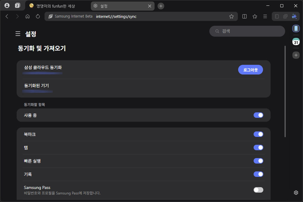 그리고 설정을 확인해 보면 북마크와 탭 그리고 빠른 실행을 동기화할 수 있는 기능이 지원되고 핵심이라고 할 수 있는 SAMSUNG PASS도 준비되어 있는데요. 삼성 패스를 이용하면 아이디와 비밀번호를 조금 더 편리하게 관리할 수 있습니다.