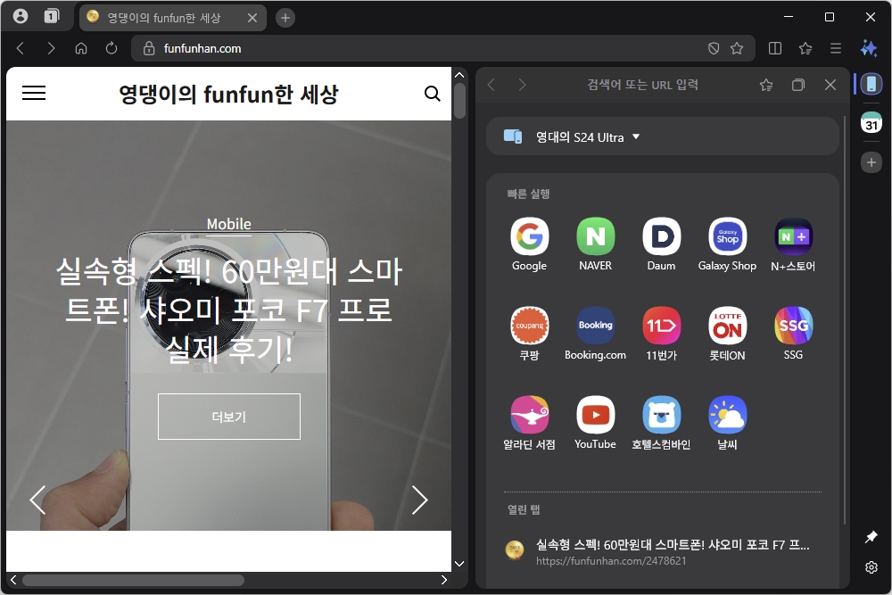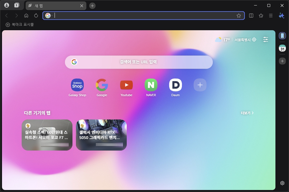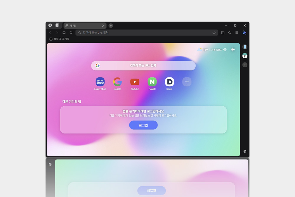 삼성 인터넷 브라우저 PC 버전의 홈 화면을 살펴보면 상단에 각종 사이트의 단축 아이콘이 배치되어 있고 현재 삼성 계정에 연결된 다른 기기에서 보고 있는 웹페이지도 탭으로 확인해 볼 수 있습니다. 사실 이러한 기능을 활용하기 위해서 삼성 브라우저를 사용하는 것입니다.