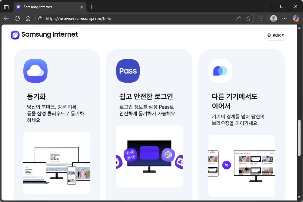 삼성 인터넷 브라우저 PC 버전 홈페이지에 접속하면 스마트폰과 태블릿 그리고 윈도우 컴퓨터에서 같이 사용할 수 있다는 내용과 함께 주요 특징이 안내되어 있는데요. 북마크와 방문 기록 동기화 기능과 함께 삼성 PASS를 사용할 수 있다는 특징이 있습니다.