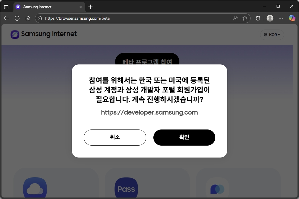 그리고 삼성 인터넷 브라우저 PC 버전의 베타 프로그램 참여를 위해서는 현재 한국과 미국에 등록된 삼성 계정과 함께 삼성 개발자 포털 회원 가입이 필요하다는 내용이 안내되는 것을 확인할 수 있습니다.