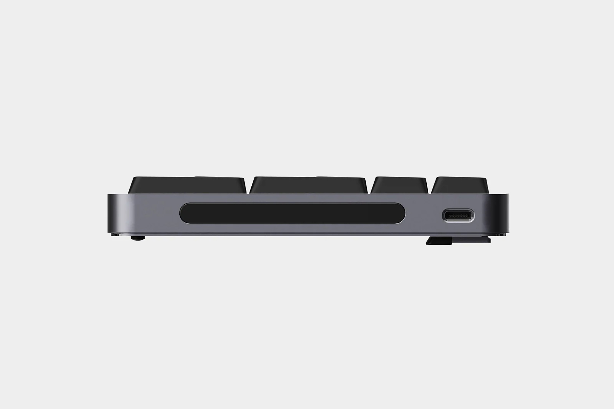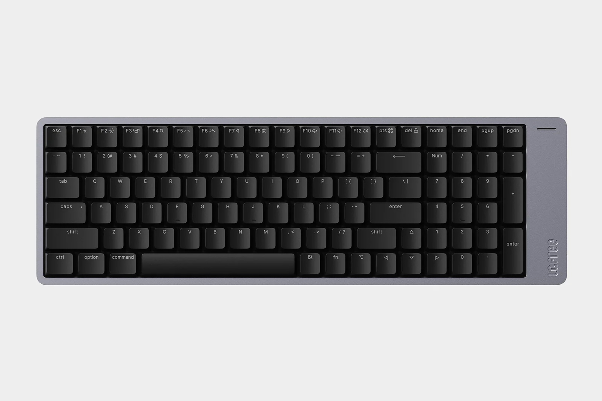 로프리 플로우2 100키는 숫자 키패드까지 포함되어 있어서 크기는 가장 크지만 가장 사무용에 가까운 제품입니다. 그리고 최근 유행하는 키보드처럼 트라이모드를 지원하는데요. 전용 동글을 이용한 2.4G와 블루투스 무선 그리고 USB-C 유선 연결을 지원합니다. 그 외에도 옆쪽에 배치된 터치 바를 이용해서 볼륨이나 화면 밝기를 조절할 수 있고 VIA도 지원합니다.