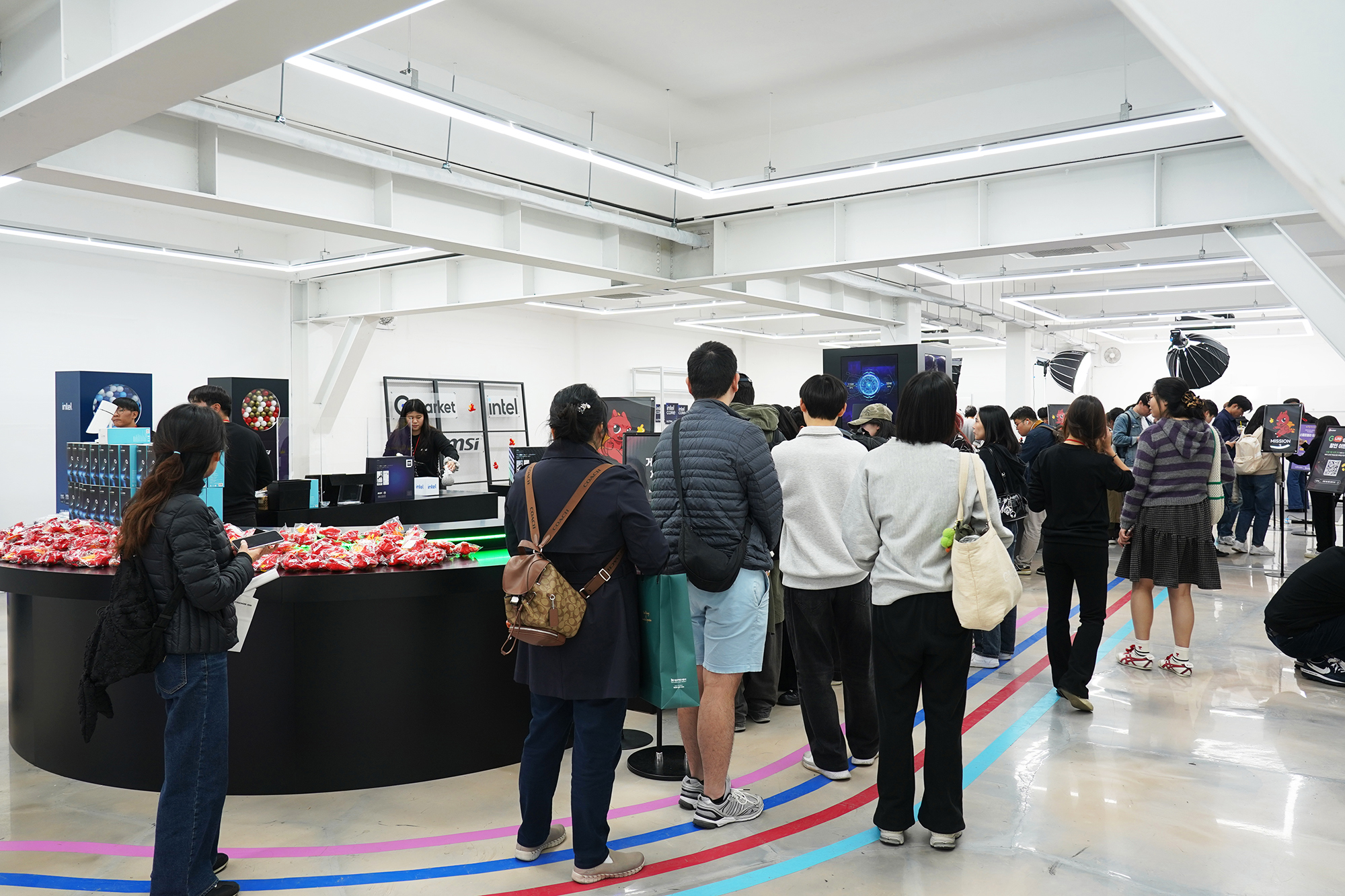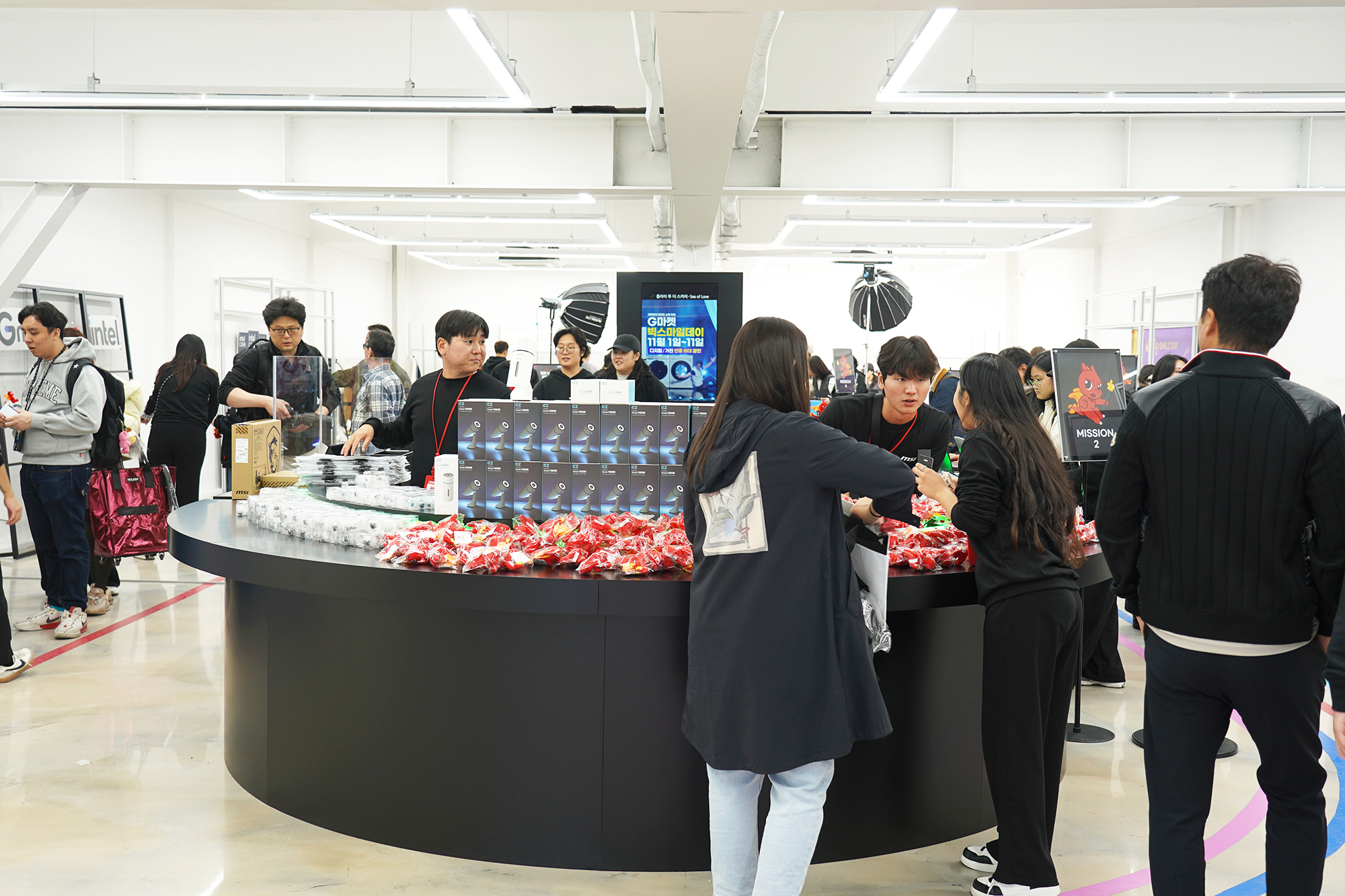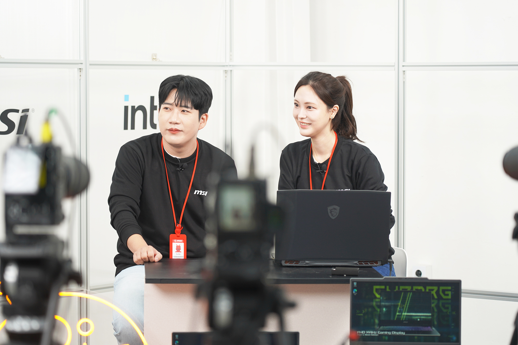 MSI 노트북 팝업 in 성수 행사장에 들어가면 우선 테이블에 어마어마하게 쌓여 있는 MSI 마스코트 럭키(용용이) 인형이 인상적이었고 각종 이벤트에 참여하기 위해서 많은 사람들이 방문해서 MSI의 노트북이나 휴대용 게임기를 체험하고 있다는 인상적이었습니다. 그리고 뒤쪽에는 MSI 노트북 G LIVE 방송이 실제로 준비되고 있었습니다. 방송 연습하는 것을 지켜보는 것도 재미있었습니다.