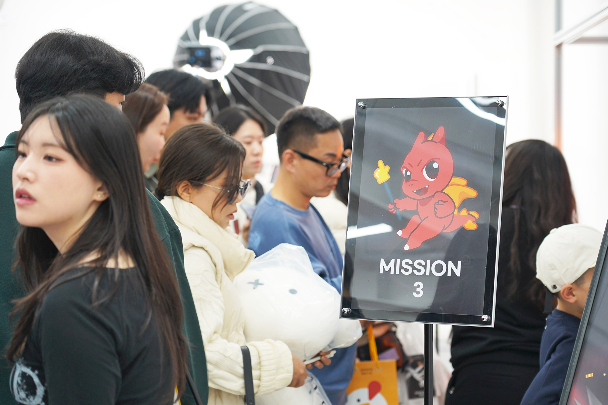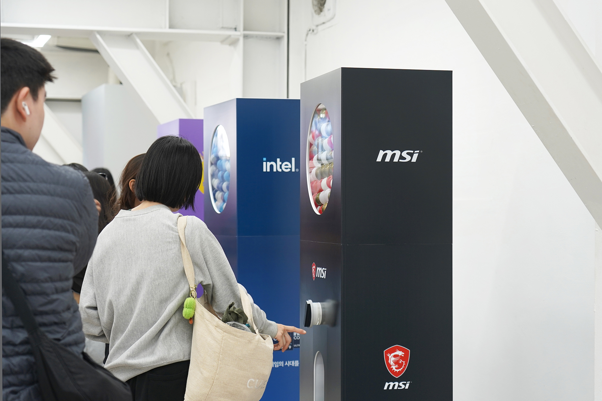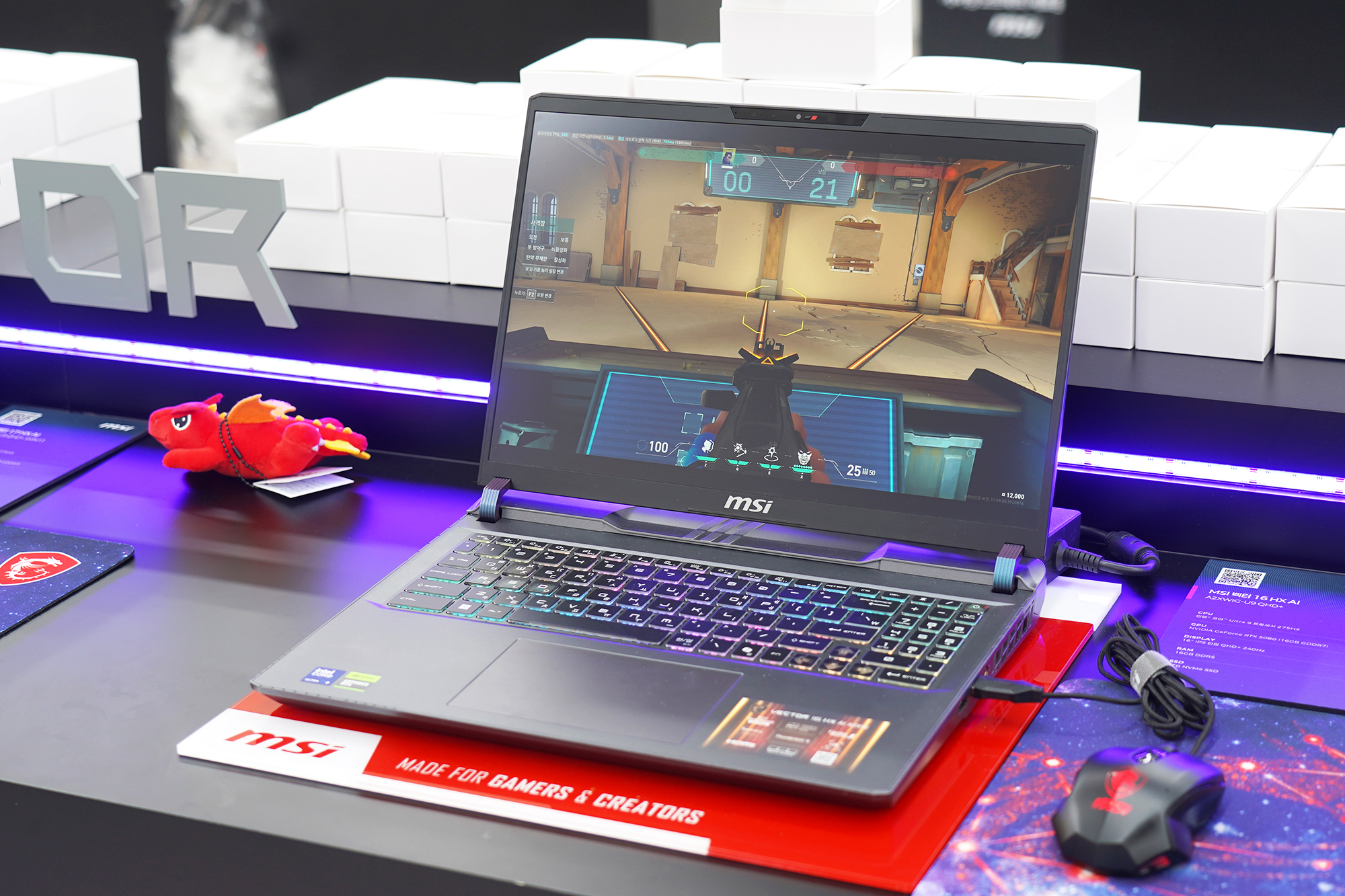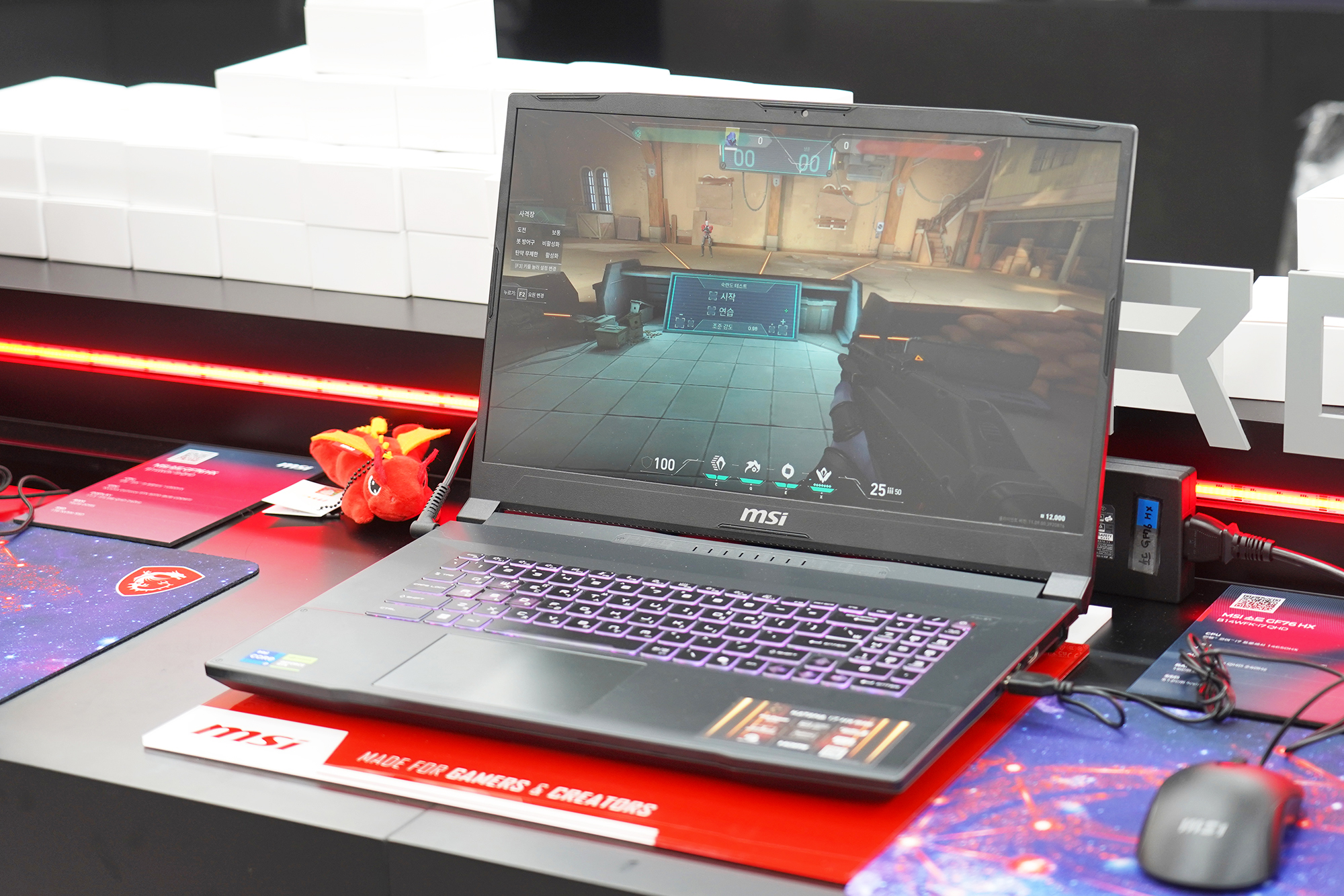 MSI 노트북 팝업 in 성수 행사장에 들어가면 우선 테이블에 어마어마하게 쌓여 있는 MSI 마스코트 럭키(용용이) 인형이 인상적이었고 각종 이벤트에 참여하기 위해서 많은 사람들이 방문해서 MSI의 노트북이나 휴대용 게임기를 체험하고 있다는 인상적이었습니다. 그리고 뒤쪽에는 MSI 노트북 G LIVE 방송이 실제로 준비되고 있었습니다. 방송 연습하는 것을 지켜보는 것도 재미있었습니다.