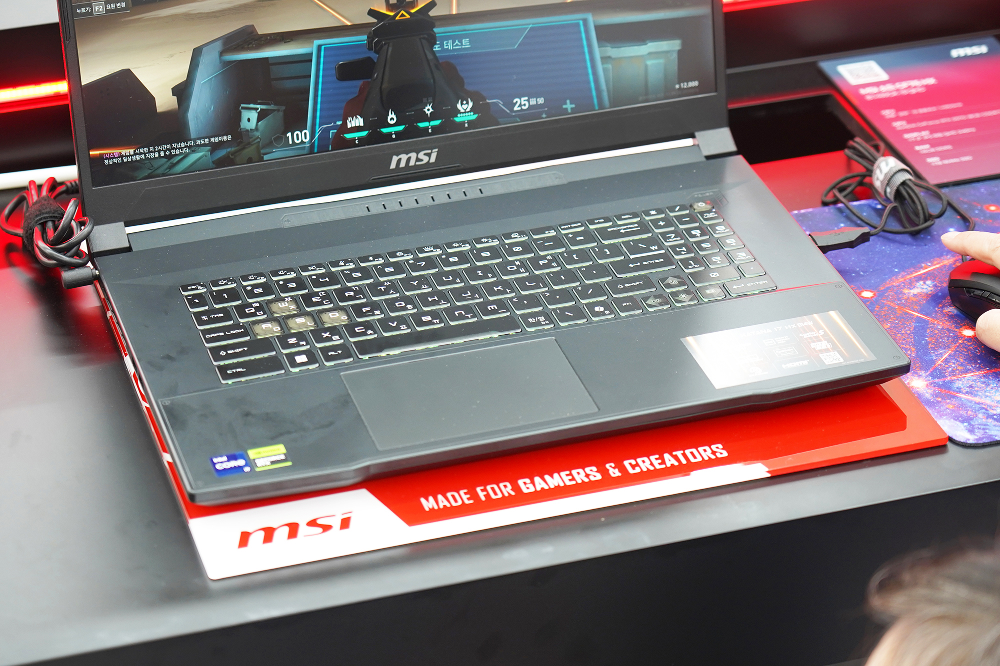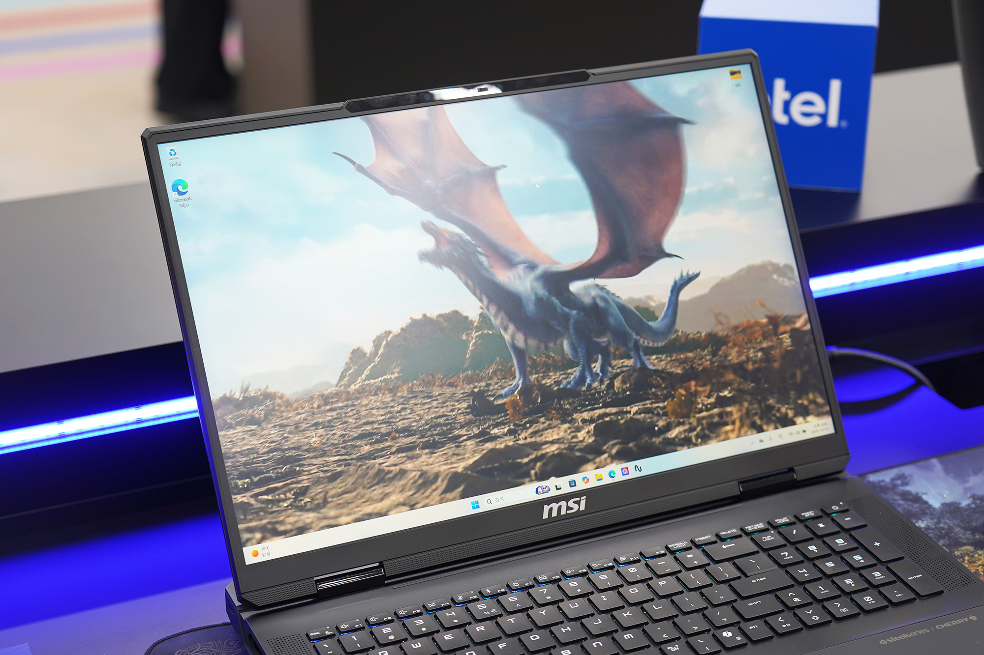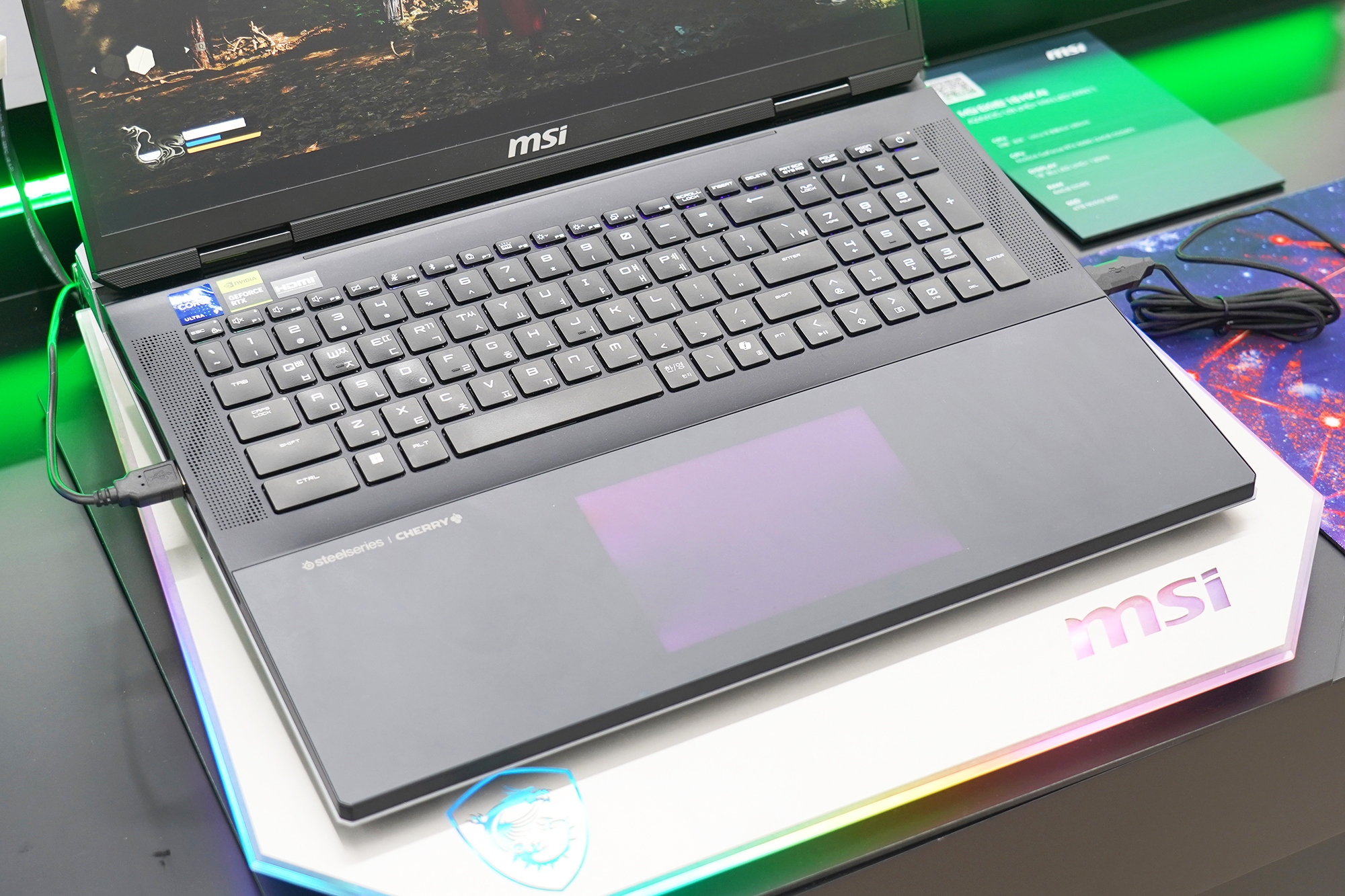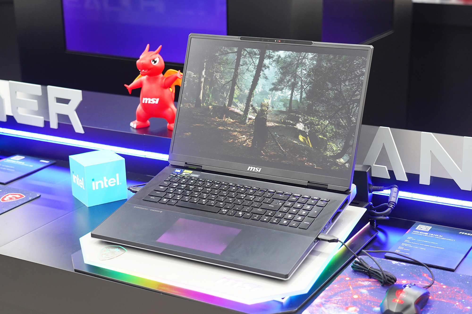 이제부터는 MSI 노트북 팝업 in 성수에 전시된 제품들을 차례대로 정리해 보도록 하겠습니다. 우선 저의 눈길을 끈 제품은 MSI 타이탄 18 HX 드래곤 에디션 Norse Myth였는데요. 무려 900만원대의 가격이 책정되었습니다. 이 정도라면 웬만한 데스크톱 PC는 성능적인 부분에서 앞설 것으로 예상됩니다.