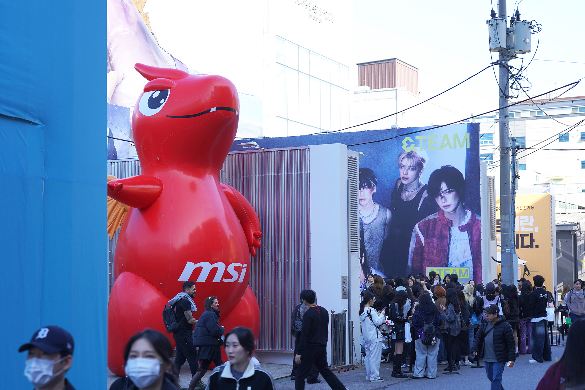 MSI 노트북 팝업 in 성수는 성수동에 있는 에스에스삼삼에서 진행되었는데요. 골목을 돌자마자 거대한 MSI 마스코트가 고개를 내밀고 있어서 평소 컴퓨터에 관심이 있는 분들이라면 들어가지 않고는 버틸 수 없게 구성되어 있었습니다. 그리고 옆쪽에 앤팀(&TEAM)의 이벤트도 같이 진행되고 있었습니다.