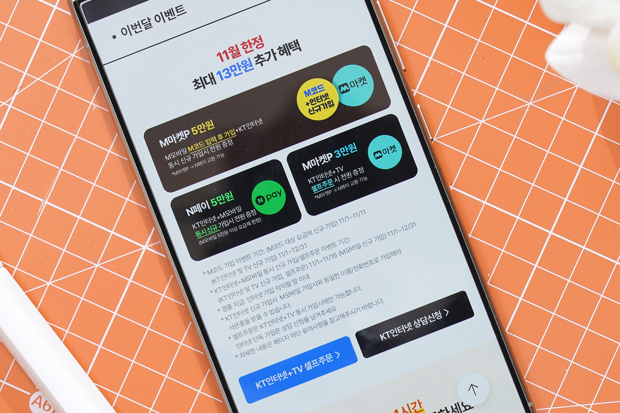 KT인터넷 + TV 셀프 주문시 : M마켓P 3만원