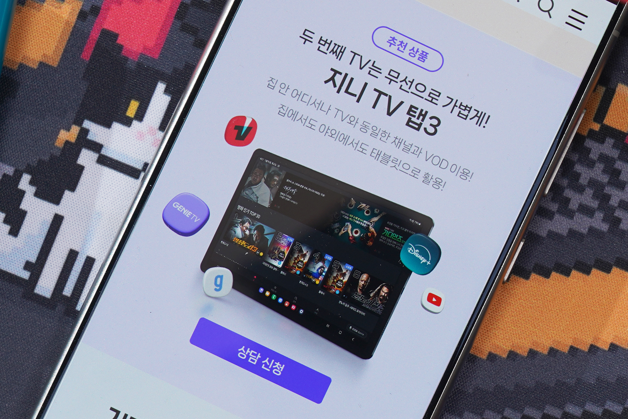 두 번째 추천 상품은 지니 TV 탭3인데요. 셋톱박스 없이도 KT IPTV 시청이 가능한 일종의 무설치 TV라고 할 수 있습니다. 그리고 태블릿 기능도 그래도 활용할 수 있기 때문에 1인 혹은 2인 가구나 아이들을 키우는 분들이 사용하면 좋을 것 같습니다.