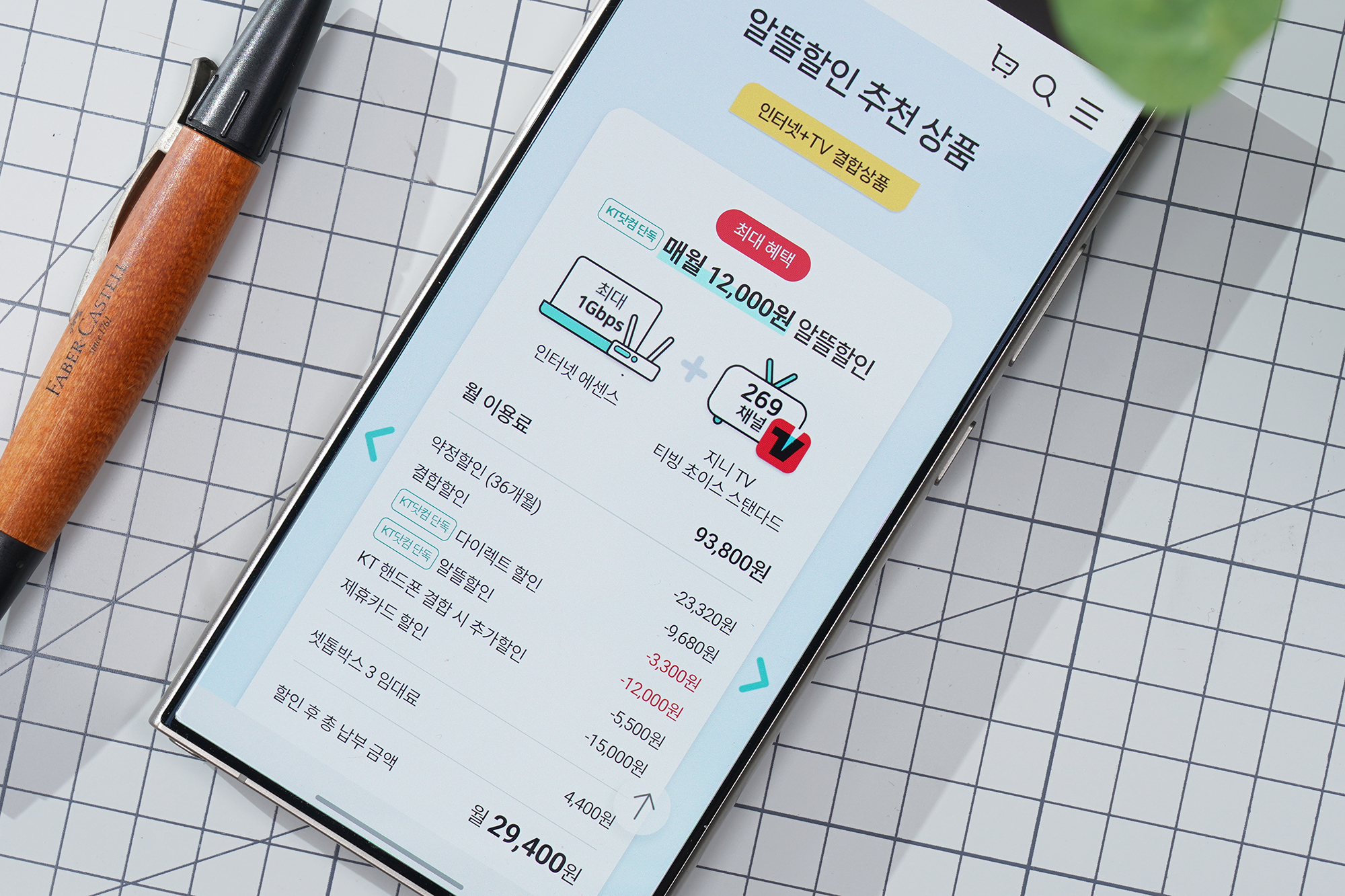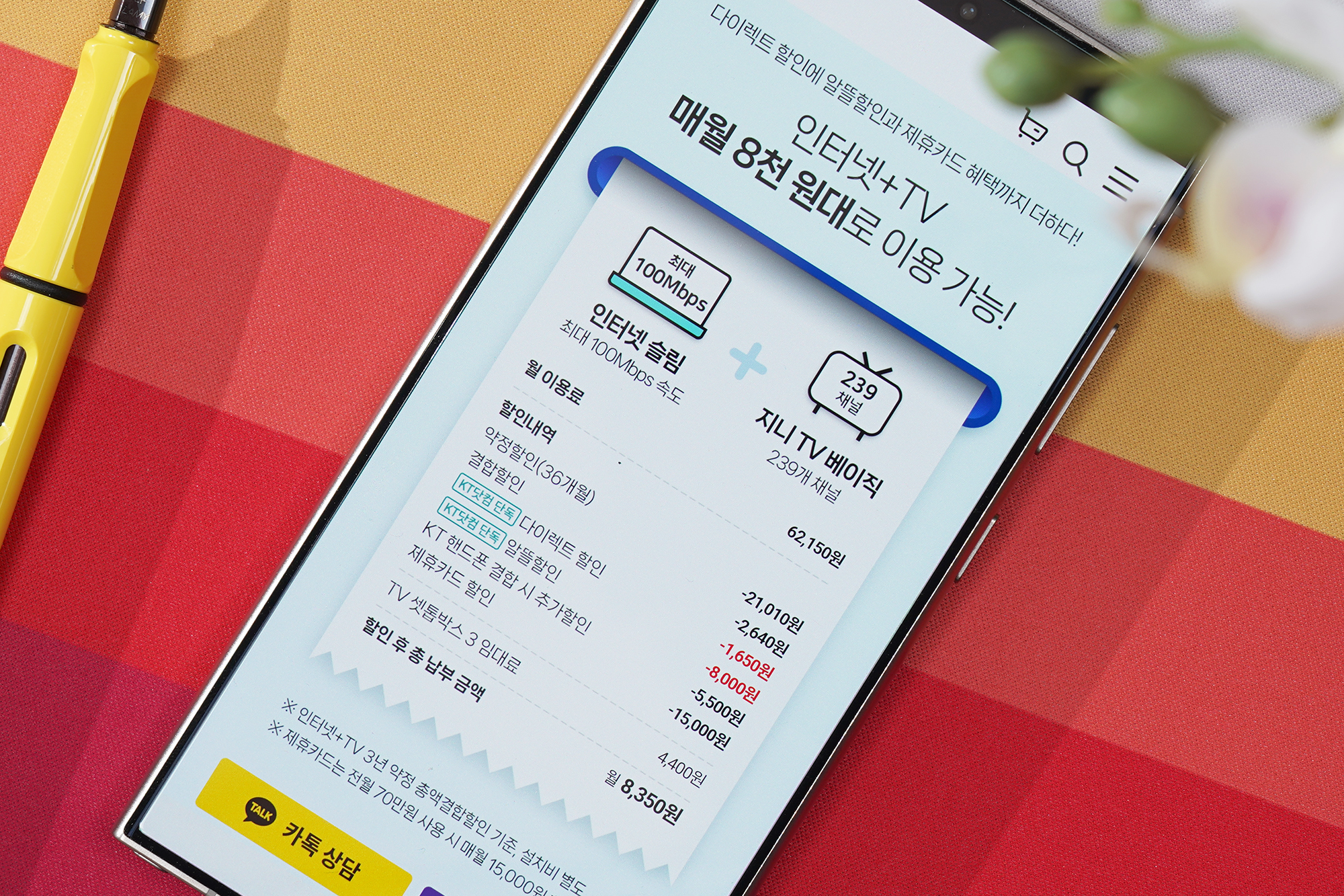 최저가 인터넷+TV 결합상품은 위에서도 설명한 인터넷 슬림(100Mbps) + 지니 TV 베이직(239채널) 구성인데요. 저렴한 편이어서 최근에 많아지고 있는 1인 가구에서 이용하면 좋을 만한 상품이라고 판단되었습니다.