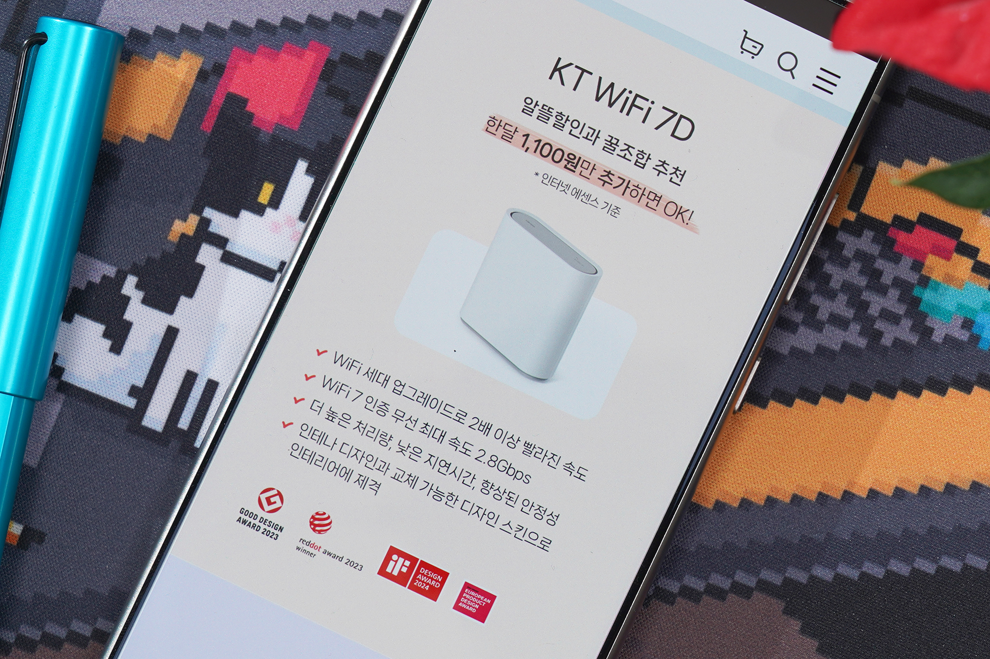 KT WiFi 7D 공유기의 또 다른 특징은 한정판 디자인 스킨을 이용해서 분위기를 변신시킬 수 있다는 점인데요. 가정의 인테리어에 따라서 다른 매력으로 사용할 수 있습니다. 참고로 독일 iF 2024, 유러피언 디자인 어워드 2023, 독일 레드닷 2023, 일본 굿디자인 2023 4종의 글로벌 디자인 어워드에서 수상한 디자인이라고 합니다.