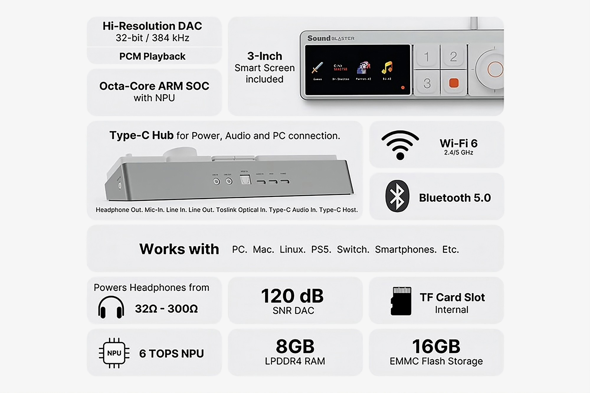 사운드 블라스터 Re:Imagine의 주요 스펙은 위와 같은데요. 사운드 관련 회사이기 때문에 32비ㅌ / 384kHz Hi-Res DAC가 탑재되었다는 특징이 있습니다. 그리고 3인치 스크린과 USB-C 허브, 와이파이6와 블루투스 5.0까지 일단 넣을 수 있는 것은 다 넣어본 느낌입니다. 그 외에도 PC와 애플 맥OS 그리고 리눅스까지 지원합니다.