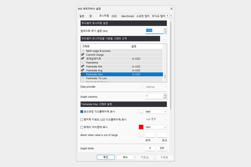 우리는 게임을 플레이할 때 화면에 프레임을 표시하는 것이 목적이기 때문에 설정을 살펴보아야 합니다. 우선 설정의 모니터링 항목을 살펴보면 프레임 레이트와 Framerate Min, Max, Avg가 준비되어 있는데요. 해당 항목의 온스크린 디스플레이에 표시 항목을 선택해 주어야 합니다.