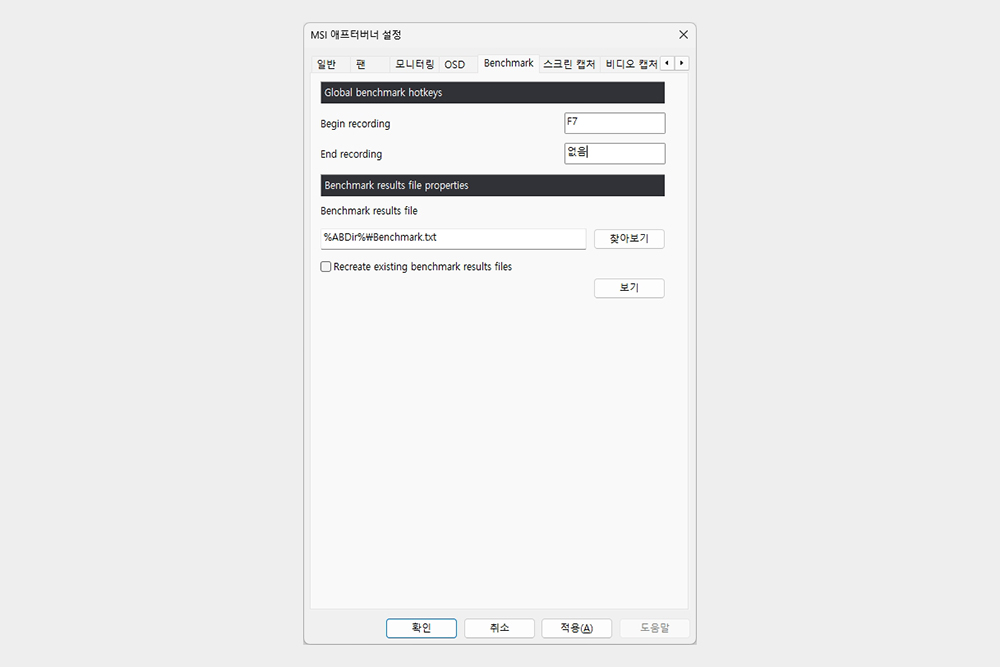 프레임의 최소와 최대 그리고 평균을 표시하기 위해서는 벤치마크(Benchmark) 기능을 활성화해야 하는데요. 우선 시작(Begin recording)과 끝(End recording) 단축키를 설정해 주어야 합니다. 그 외에도 프레임 정보가 표시되는 텍스트 파일을 저장하는 위치도 설정할 수 있습니다.
