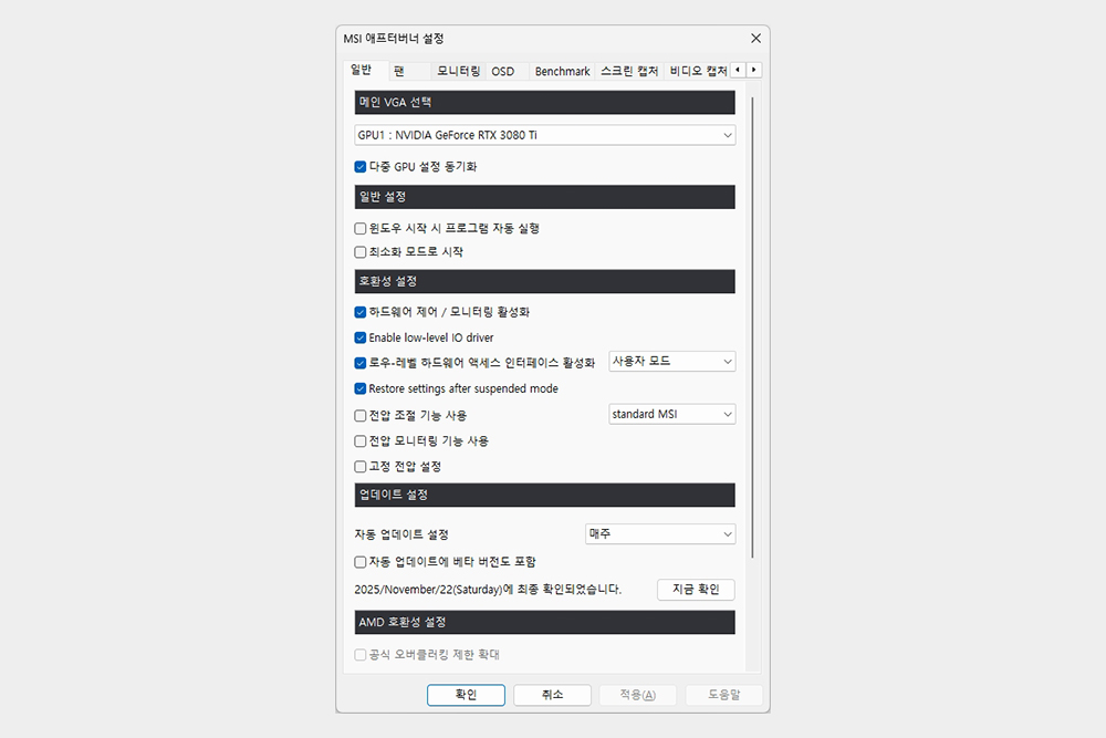 MSI 애프터버너는 일부 한글화되어 있기 때문에 설치할 때 한국어를 선택해 주면 조금 더 편리하게 활용할 수 있습니다. 사실 영어로 설정해도 크게 어려운 부분은 없는 편입니다.